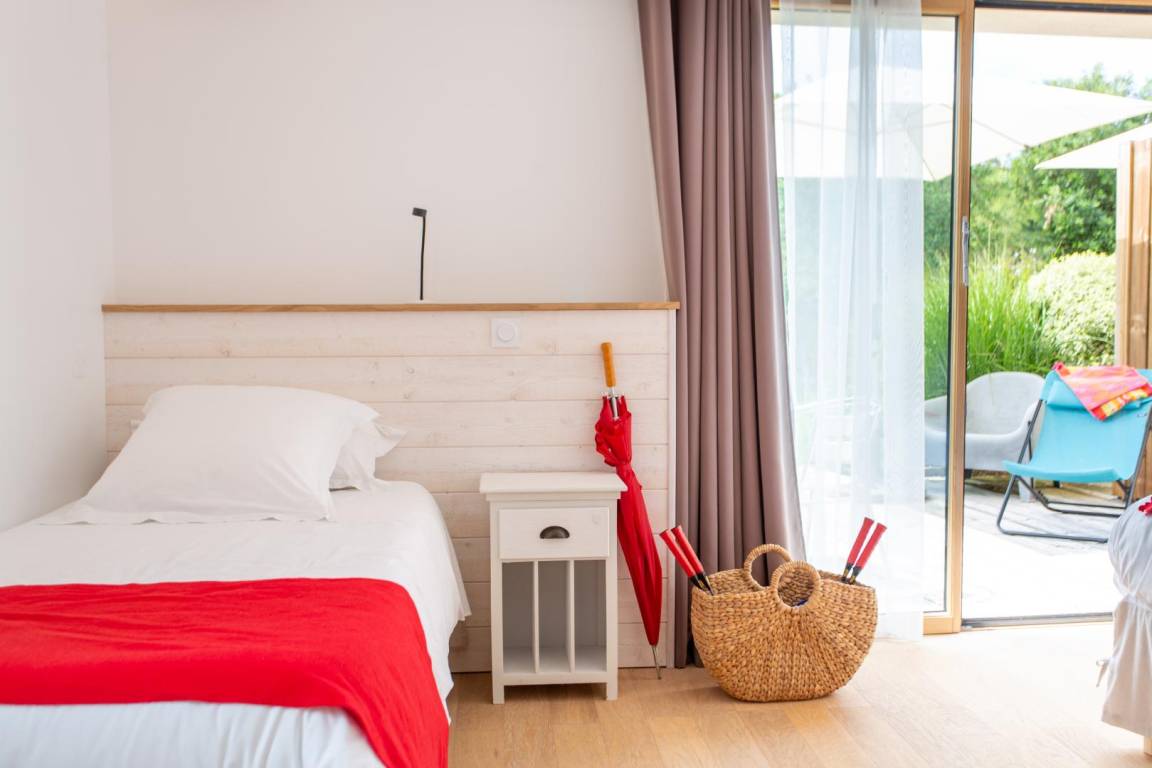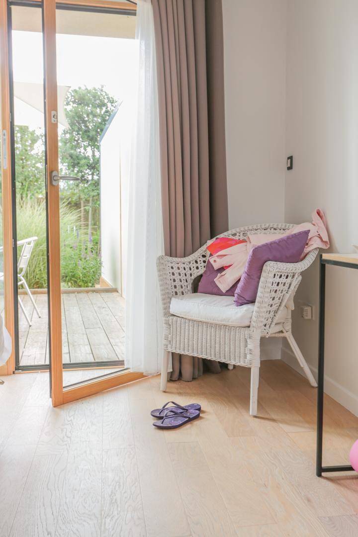 Schlafzimmer „Poppy" (3 Schlafplätze): 1 komfortables Kingsize-Bett (180 x 200 cm) und 1 Einzelbett (90 x 200 cm) oder 3 Einzelbetten (90 x 200 cm), eigenes Duschbad mit Dusche und WC. Terrasse mit Blick auf den Garten. Dieses Schlafzimmer ist barrierefrei.