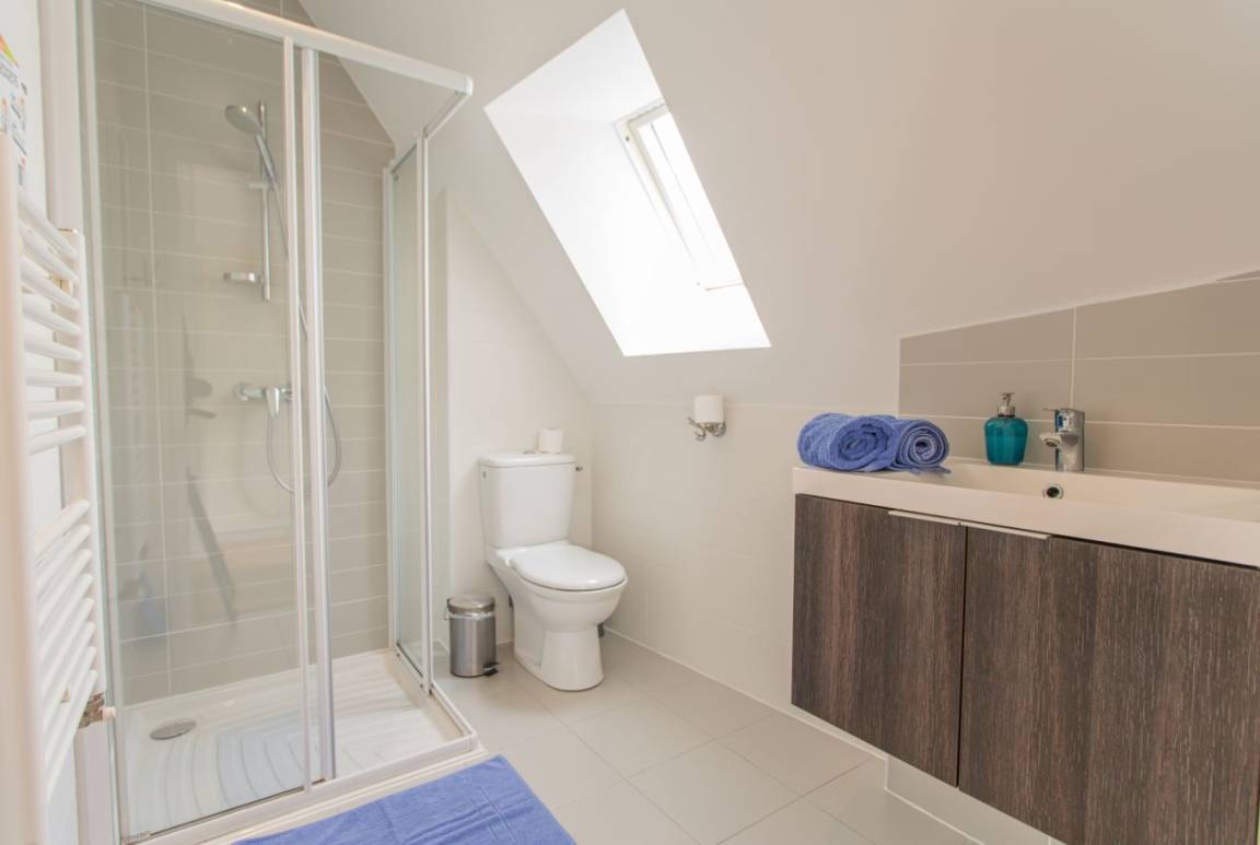 Im ersten Stock verfügt jedes Schlafzimmer über ein eigenes Badezimmer mit Dusche und WC sowie einen separaten Eingang über eine Außentreppe: