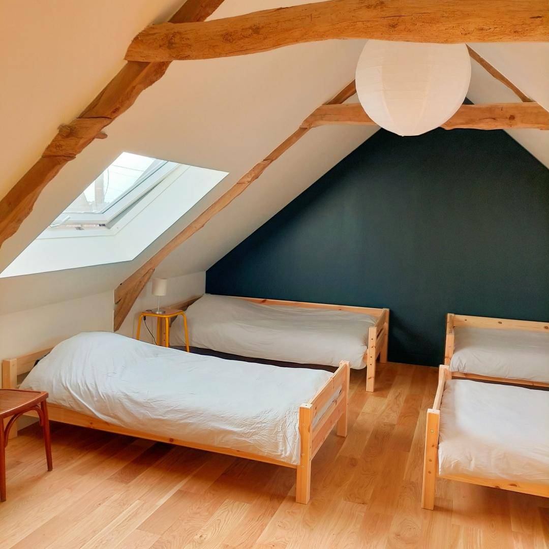 Die Zwischenstation bietet zwei separate Schlafsäle im 1. Stock (8 und 5 Personen) mit Einzelbetten (einige Etagenbetten) und zwei Duschbäder mit WC (einer im 1. Stock, der andere im 2. Stock). Ein Wohnzimmer ist für Sie reserviert und eine Selbstversorgerküche steht Ihnen zur Verfügung (Zimmer nur morgens und abends zugänglich). Draußen teilen Sie sich eine mit Kies bestreute Terrasse und einen Garten mit den Teestuben-Kunden. Sie haben einen eigenen Eingang zum Haus vom Garten aus und der Zugang zu den Schlafsälen erfolgt über die Treppe im Laden. Für die Betten werden die Ziehlaken sowie die Laken für die Matratzen bereitgestellt. Optional: Verleih von Bettdecke mit Bezug: 4 € / Bett und das Handtuch kostet 2 €. Gite jeden Montag und Dienstag geschlossen (außer bei Aufenthalten von mehr als 2 Nächten).