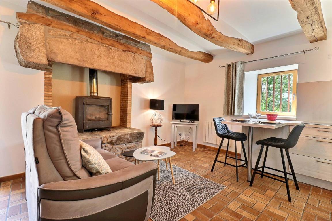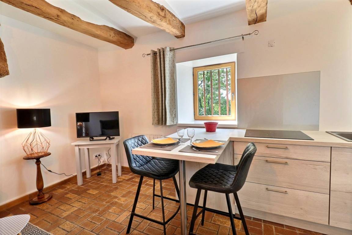 Die Gîte ist wie folgt: im Erdgeschoss ein Wohnzimmer mit Lounge, Einbauküche und Essbereich, eine Toilette mit Waschbecken.
