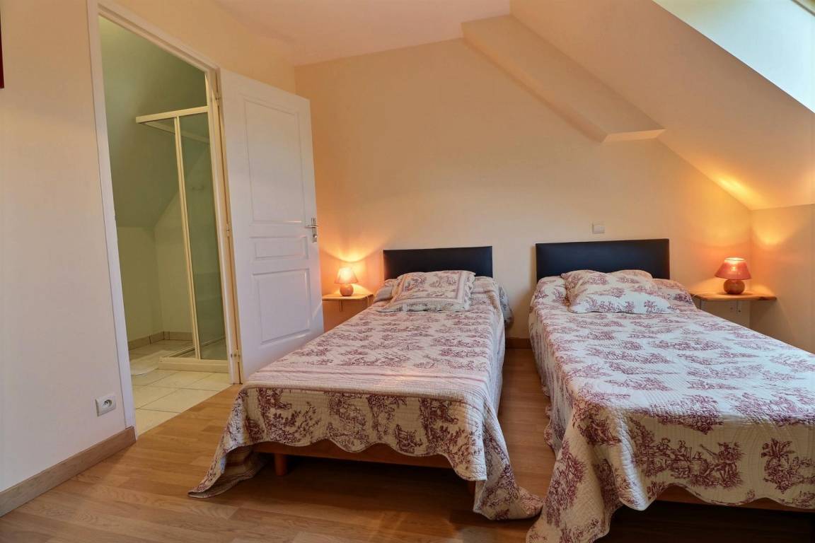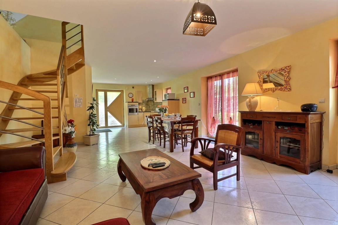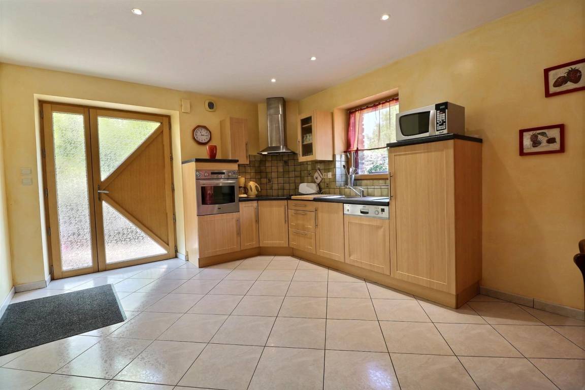Im EG: Esszimmer mit ausgestatteter Küche, Wohnzimmerecke (Schlafcouch), Toilette (WC mit Handwaschbecken). Im Stockwerk: Mezzanin mit 1 Einzelbett, 2 Schlafzimmer jeweils mit Bad mit Dusche und WC (1 Doppelbett, 2 Einzelbetten). Elektrische Fußbodenheizung + Heizkörper. Babybett auf Anfrage. Ferienhaus mit Steppdecken.