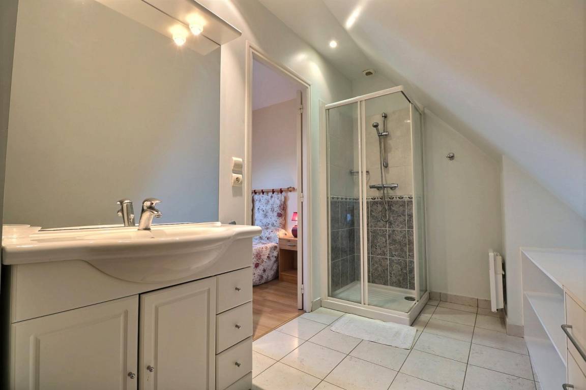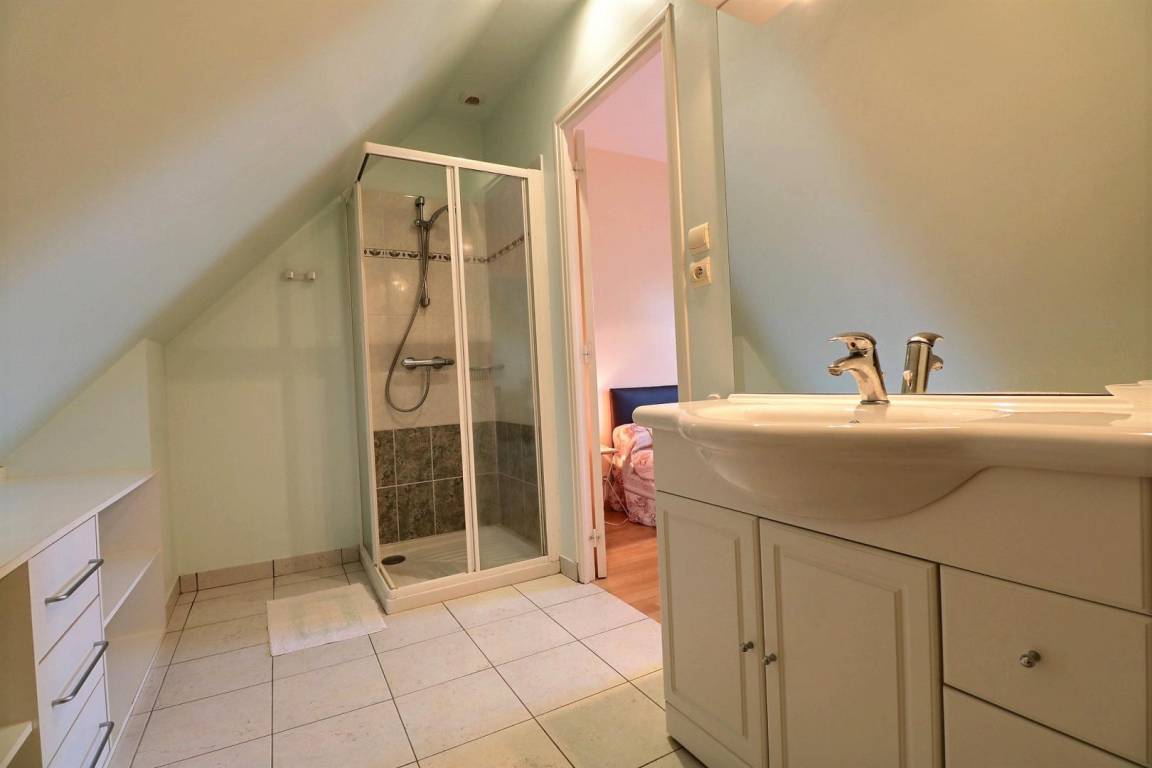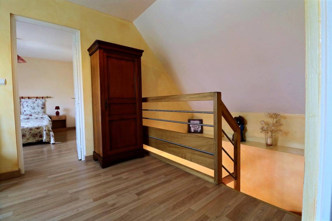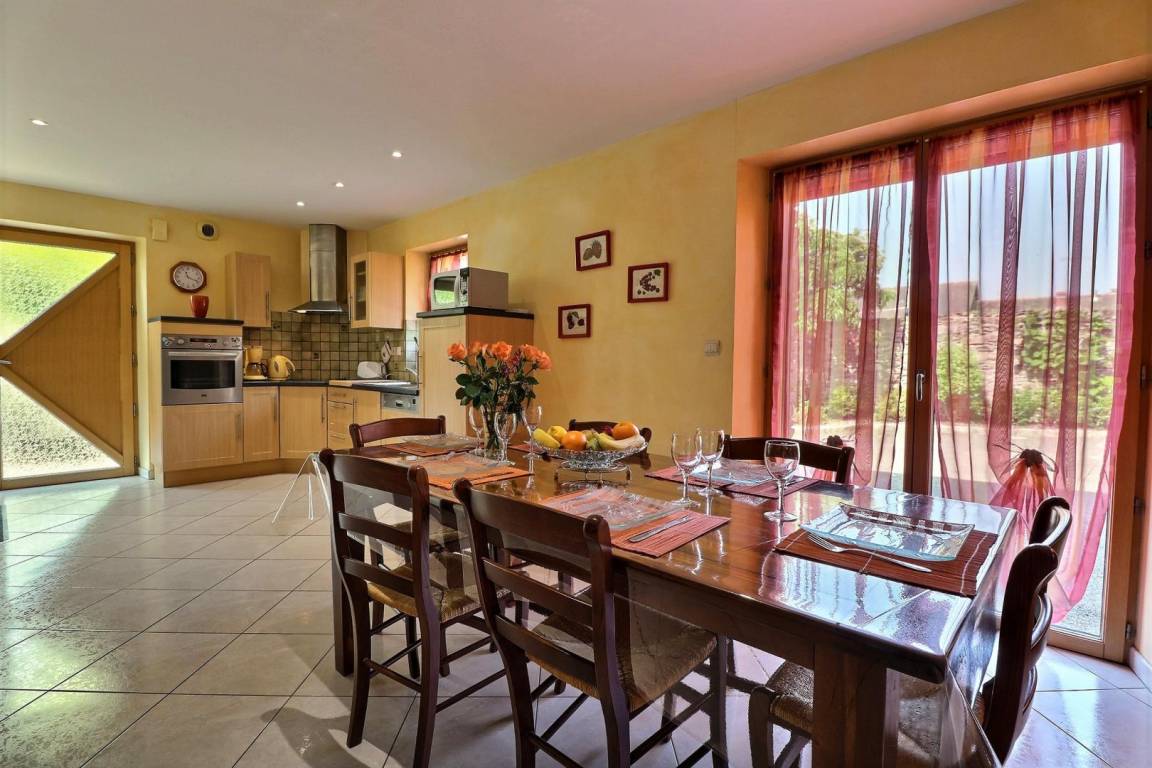 Im EG: Esszimmer mit ausgestatteter Küche, Wohnzimmerecke (Schlafcouch), Toilette (WC mit Handwaschbecken). Im Stockwerk: Mezzanin mit 1 Einzelbett, 2 Schlafzimmer jeweils mit Bad mit Dusche und WC (1 Doppelbett, 2 Einzelbetten). Elektrische Fußbodenheizung + Heizkörper. Babybett auf Anfrage. Ferienhaus mit Steppdecken.