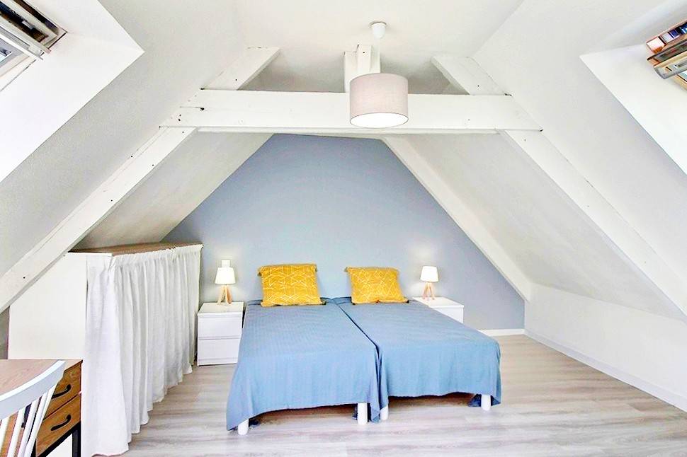 -Obergeschoss: ein großes Schlafzimmer mit zwei 90-cm-Betten und ein Badezimmer.