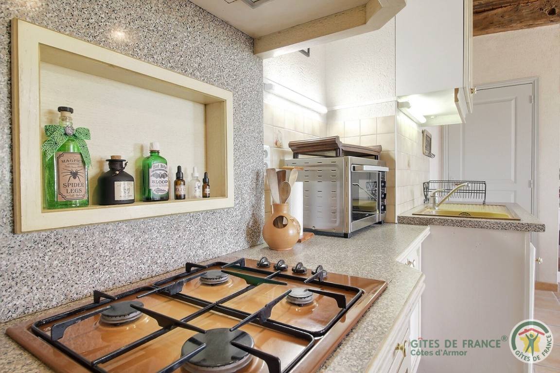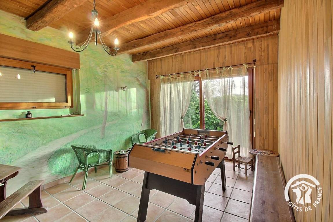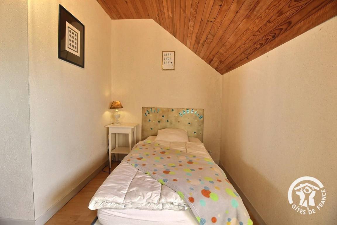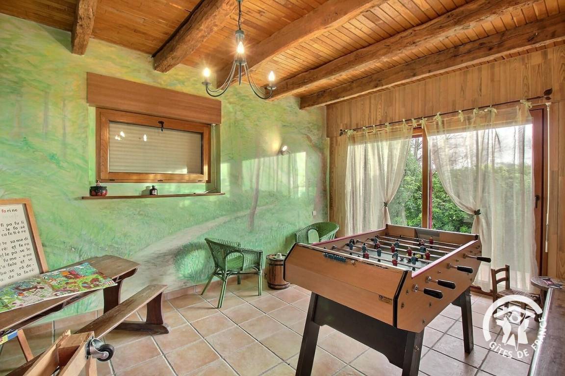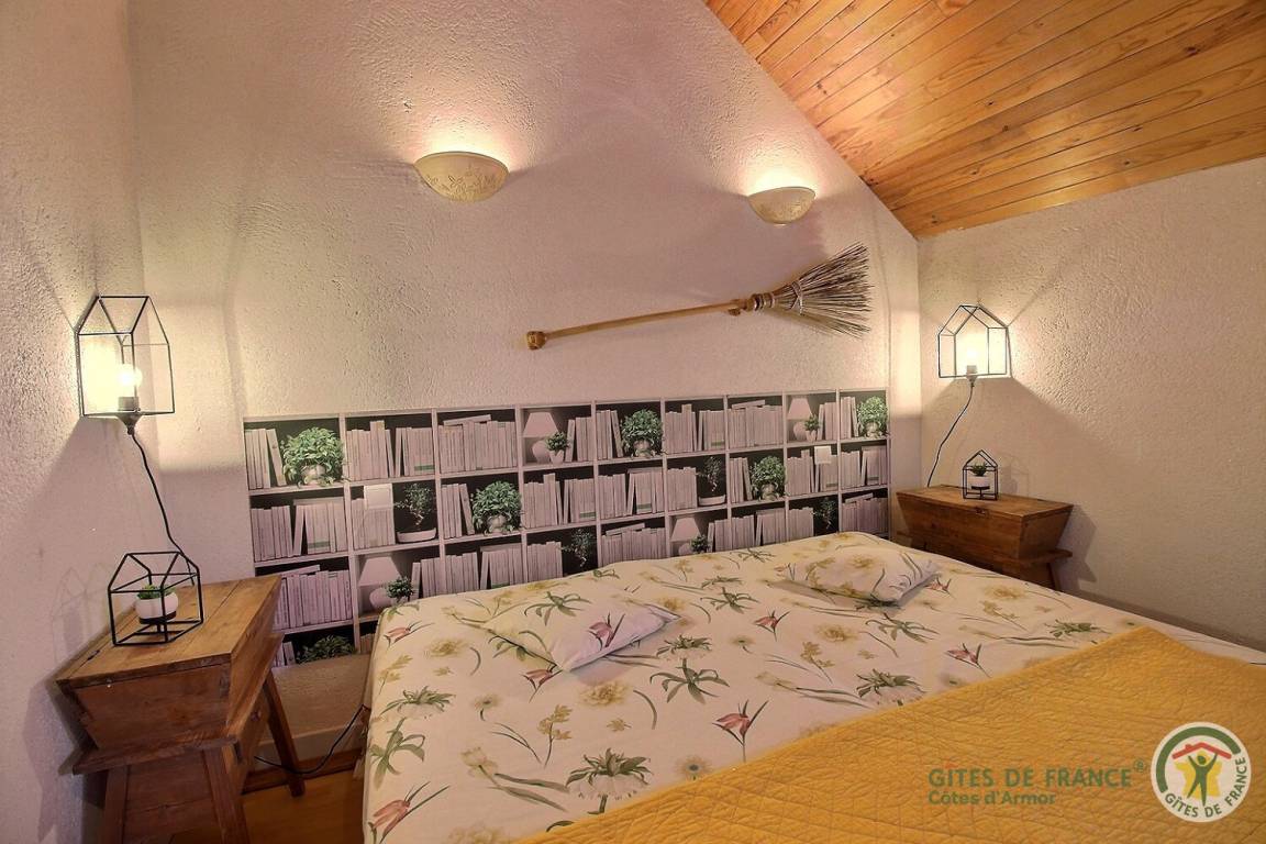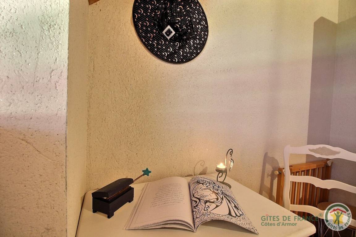 Neben den vielen Hinweisen auf diesen renommierten Zauberer ist das Haus perfekt ausgestattet, um 5 Personen unterzubringen. Die Einbauküche mit ihren Kannen und Tischen wird Sie verzaubern. Im Wohnzimmer, umgeben von einem magischen Heiligenschein, finden Sie unter dem Kamin den Kessel, mit dem Merlin unglaubliche Tränke herstellte. Eine kleine Hexe führt Sie auf ihrem magischen Besenstiel ins Badezimmer und ins WC. Im Obergeschoss bieten die drei Schlafzimmer (1 160 x 200 Bettdecke vorhanden), 2 90 cm Betten, die zusammengestellt werden können, 1 90 cm Bett] gemütliche Betten, in denen Sie eine magische Nacht verbringen werden. Die Besen bleiben an der Wand befestigt, damit Sie ruhig träumen können! Entspannen Sie im Badezimmer mit Dusche und WC. Lassen Sie sich im Außenbereich vom Entspannungsraum Brocéliande und seinem lebensgroßen Fresko verzaubern. Und für die kleinen Zauberer erwartet Sie ein großer Spielplatz mit Sandkasten, Rutsche und Klettergerüst..