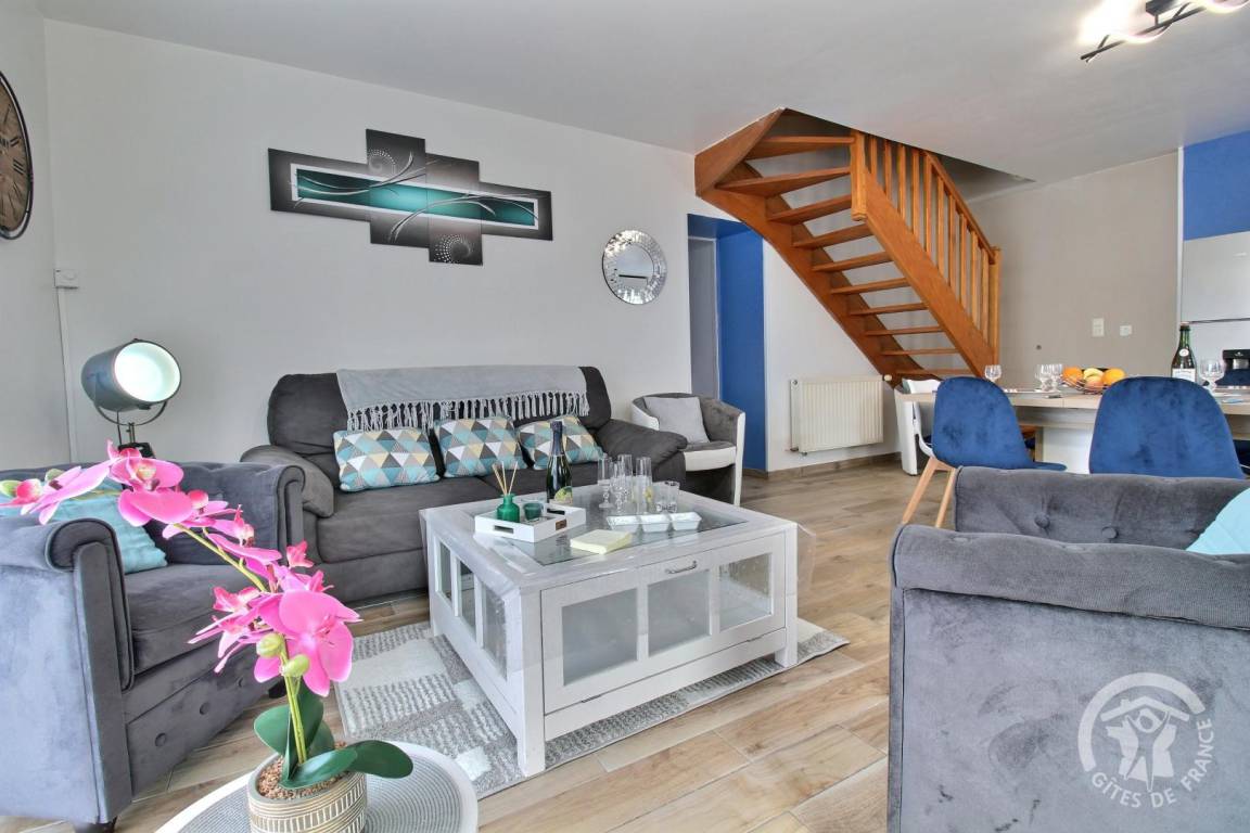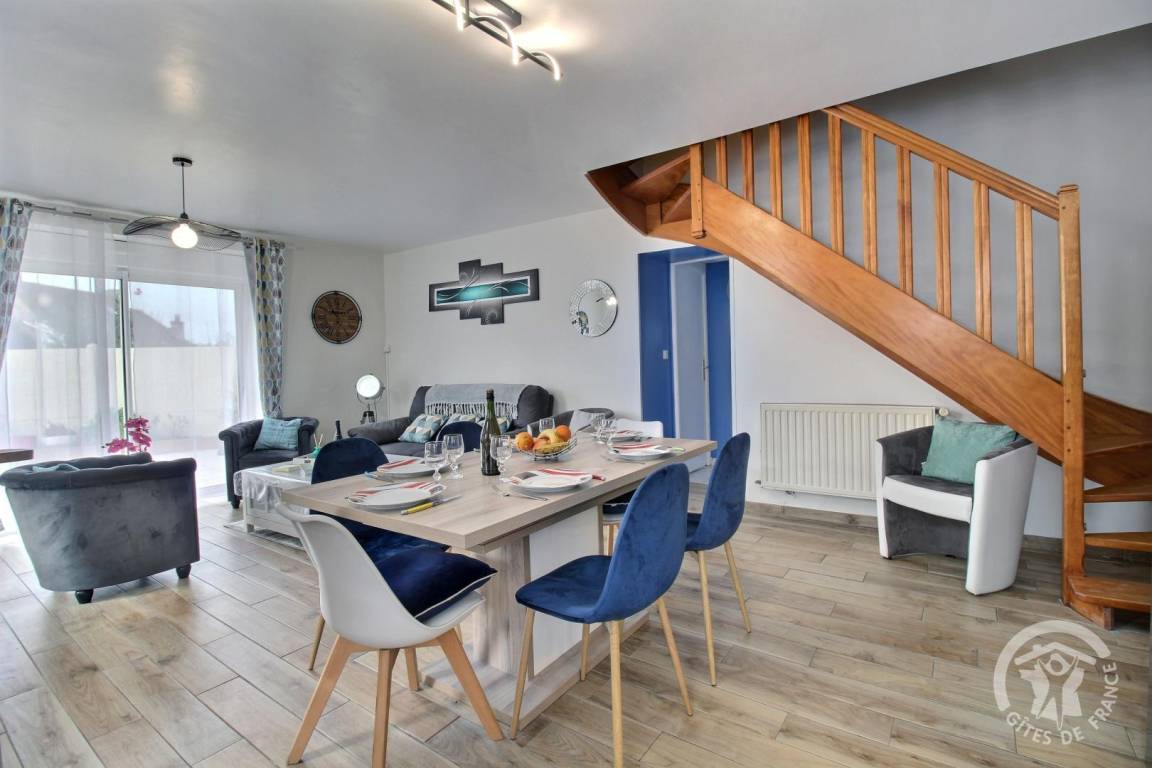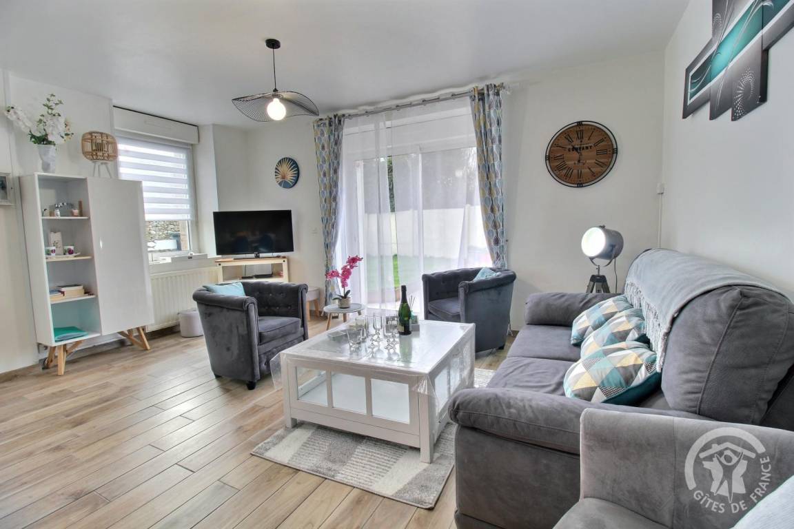 Ihre Ferienwohnung umfasst im Erdgeschoss: eine ausgestattete Küche offen zu einem Wohnzimmer und seiner Lounge, eine Waschküche/Abstellraum und ein Duschbad mit WC. Im 1. Stock: zwei Schlafzimmer mit 1 Bett 160x200 und 1 Bett 140x190 und ein Duschbad mit WC auf dem Treppenabsatz. Im 2. Stock: zwei Schlafzimmer mit je einem 90x190 Bett. Draußen kleiner umzäunter Garten mit Rasenfläche, Terrasse und Lagerchalet. Reservierter Platz entlang des Giebels des Hauses zum Parken eines Fahrzeugs. Andere Parkmöglichkeiten weniger als 100 m vom Haus entfernt. Ferienhaus an einer ruhigen Straße gelegen.