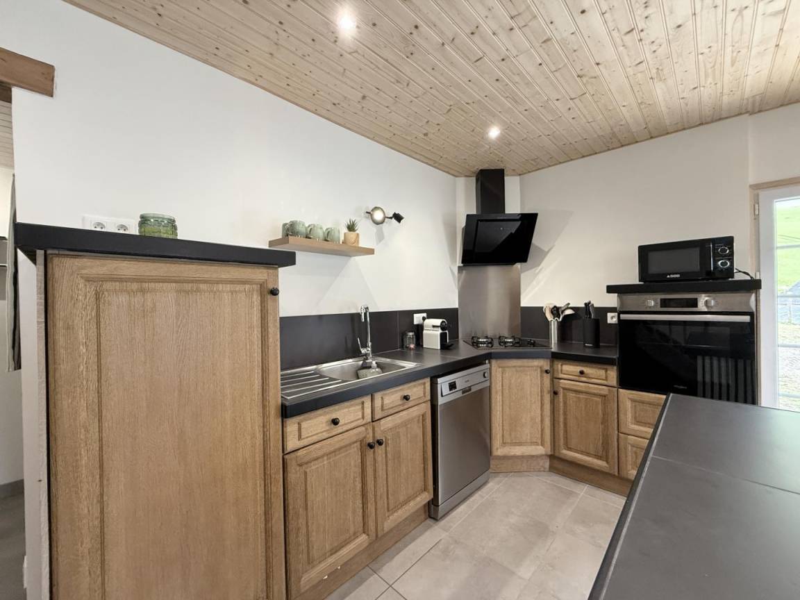 - Küchenbereich im Inselstil (Kühlschrank, Geschirrspüler, Gas- und Induktionskochfeld, Mikrowelle, Nespresso-Kaffeemaschine, Raclette- und Fondue-Set)