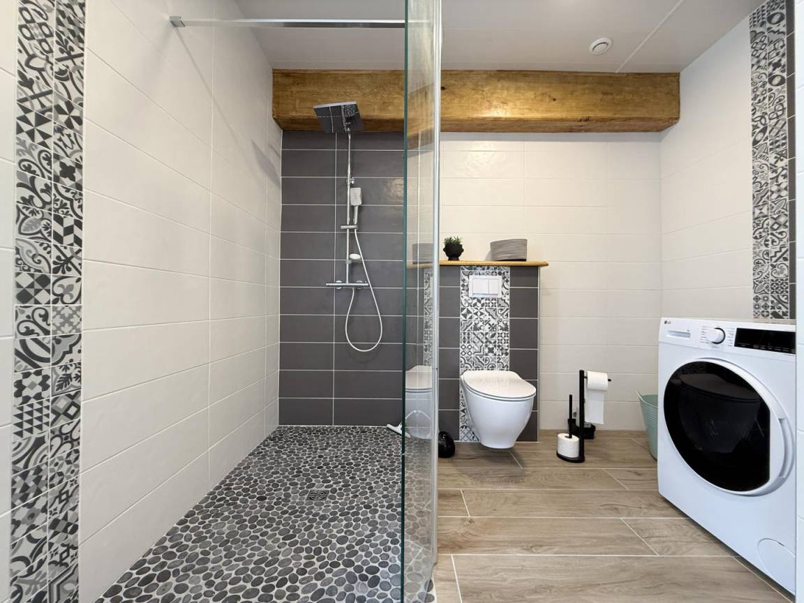 - Duschraum (große Dusche, Waschbecken, WC, Waschmaschine).