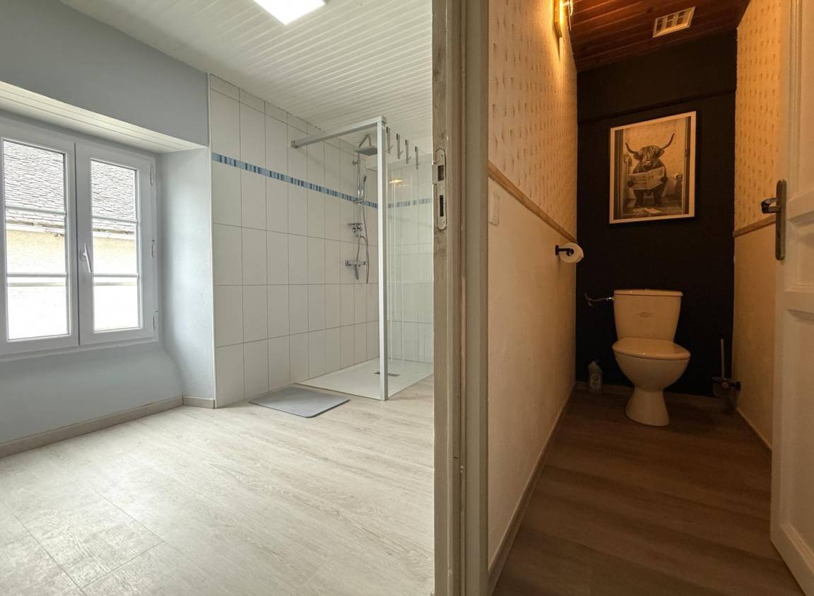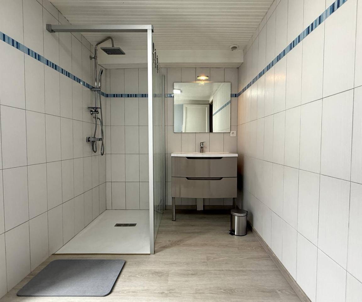 - Duschraum (große Dusche, Waschbecken). Separates WC.