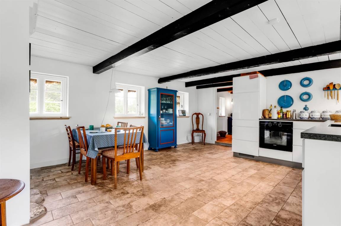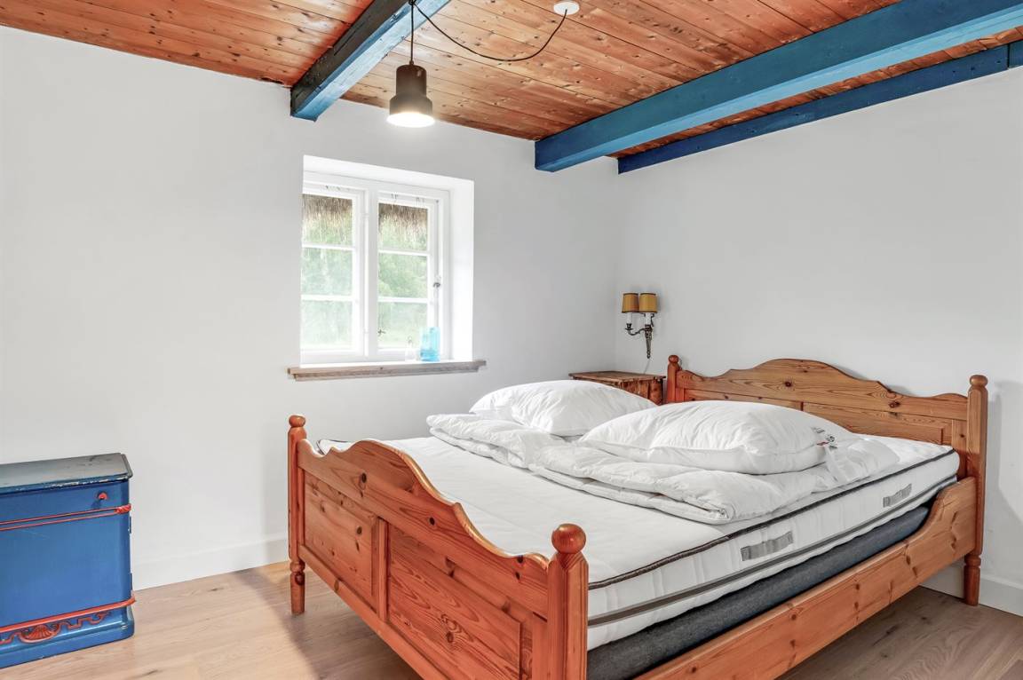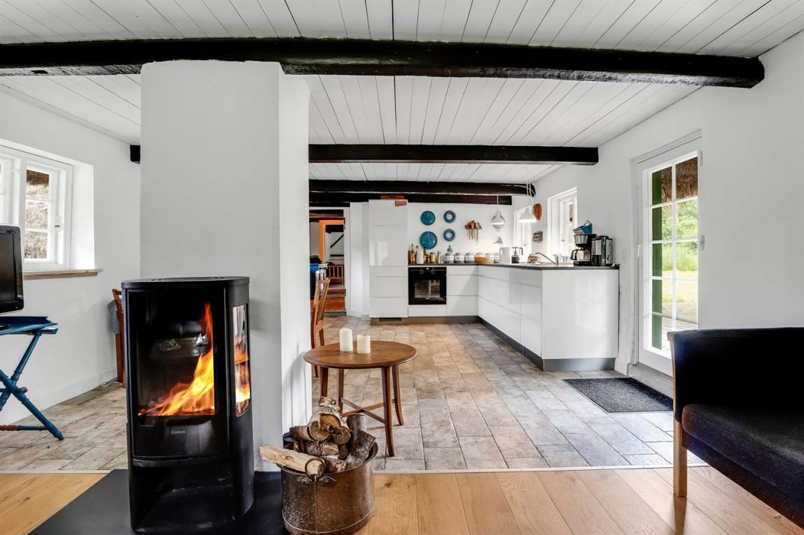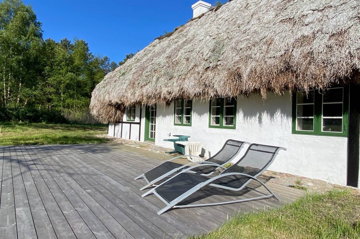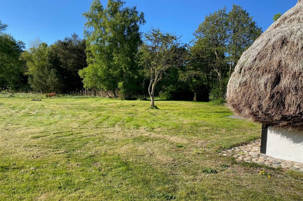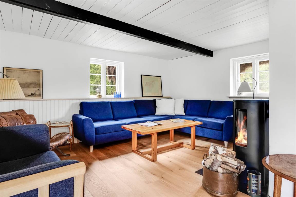 Auf einem großen Grundstück liegt dieses wunderschöne Ferienhaus. Hier hast du einen weiten Himmel über dir und jede Menge Natur, Ruhe und Vogelgezwitscher. Der alte Hof wurde im Jahr 1700 gebaut und hat das charakteristische Tangdach, für das Læsø bekannt ist.