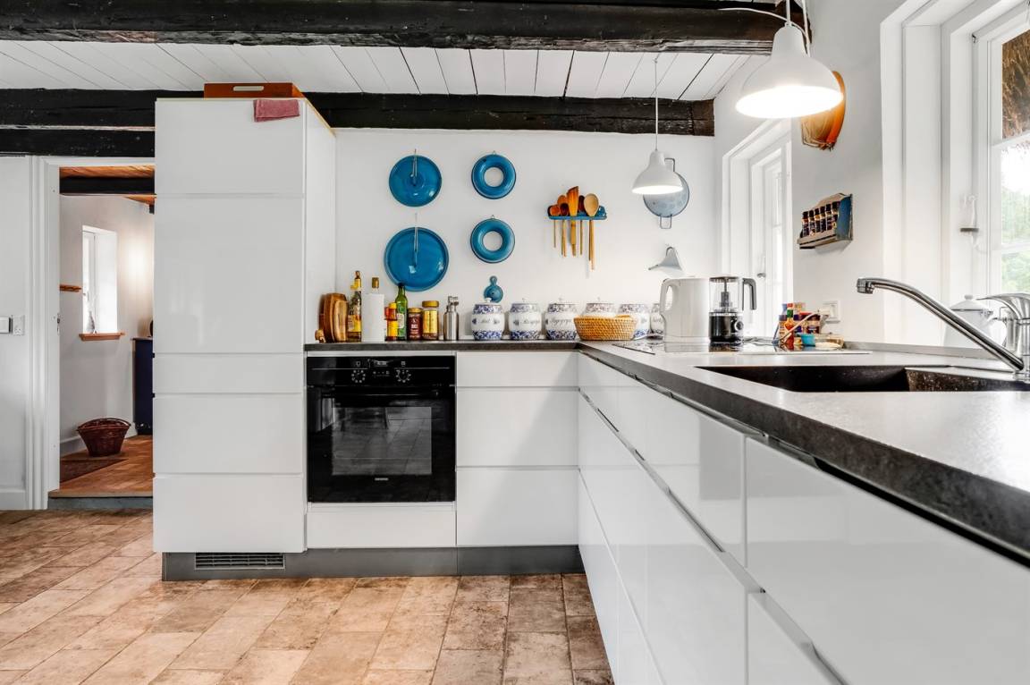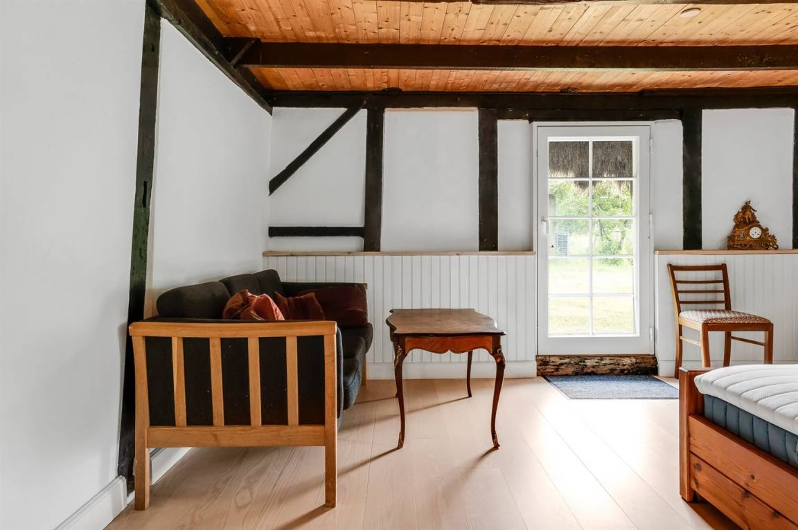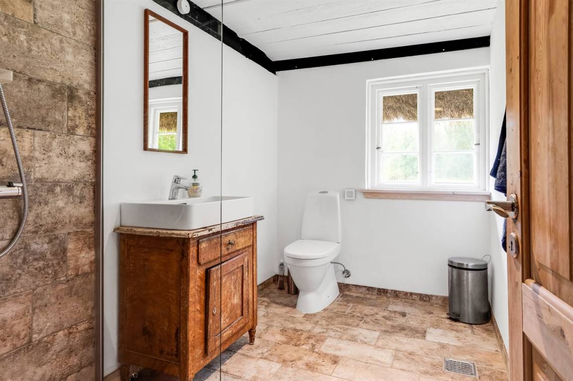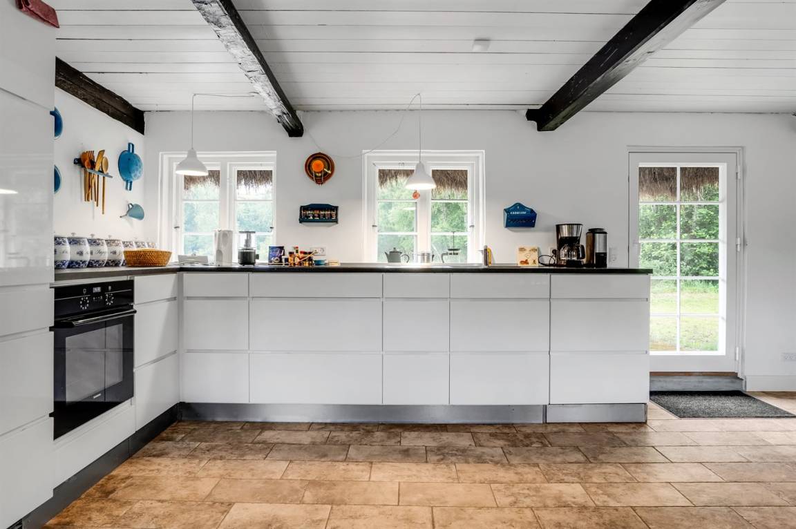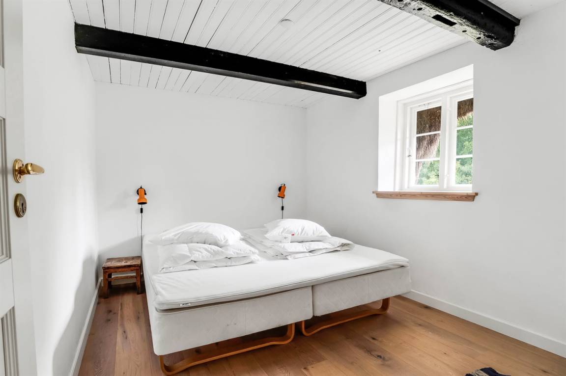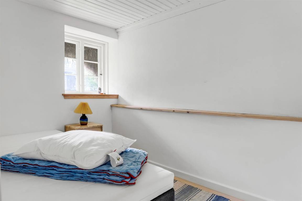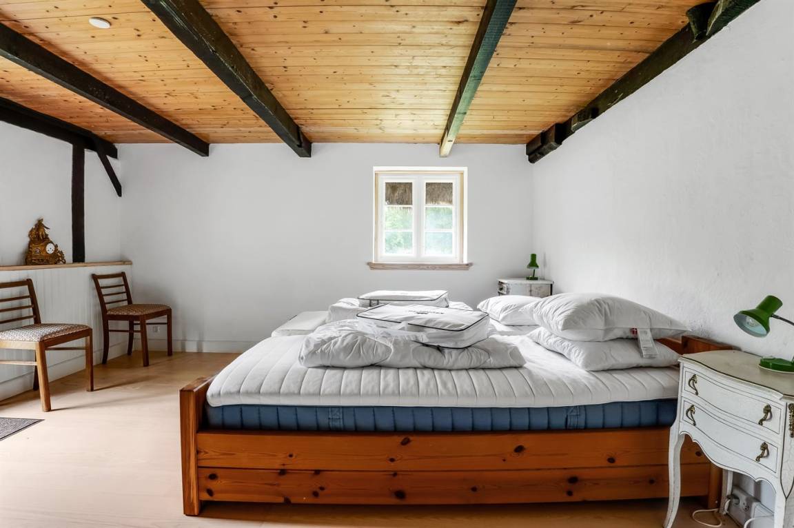 Auf einem großen Grundstück liegt dieses wunderschöne Ferienhaus. Hier hast du einen weiten Himmel über dir und jede Menge Natur, Ruhe und Vogelgezwitscher. Der alte Hof wurde im Jahr 1700 gebaut und hat das charakteristische Tangdach, für das Læsø bekannt ist.