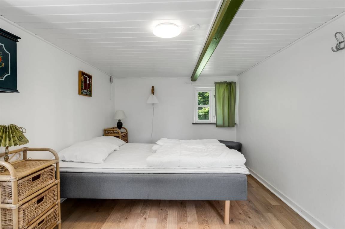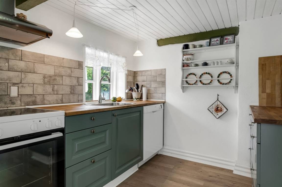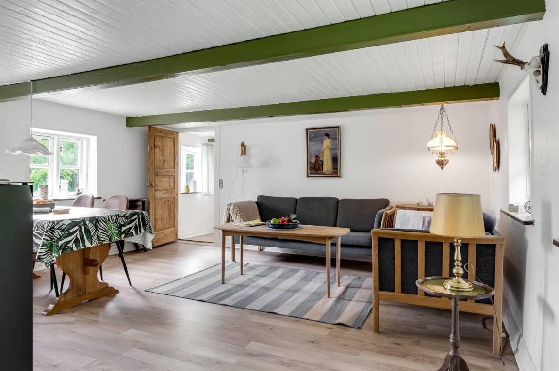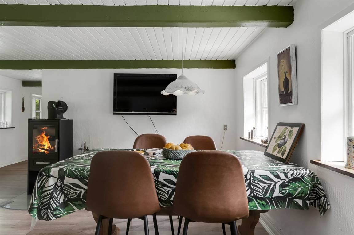 Das Ferienhaus liegt ungestört mit Wald und Feldern als nächster Nachbarschaft und mit reichlich Wildtieren in der Umgebung. Die Decken sind niedrig (175 cm), doch dafür wurde das Haus 2023 umfassend renoviert. Es verfügt über einen Eingangsbereich, ein Badezimmer mit Duschnische sowie eine Küche mit Essplatz, die offen in das Wohnzimmer mit Kaminofen und Wärmepumpe übergeht, sowie über zwei gute Schlafzimmer.
