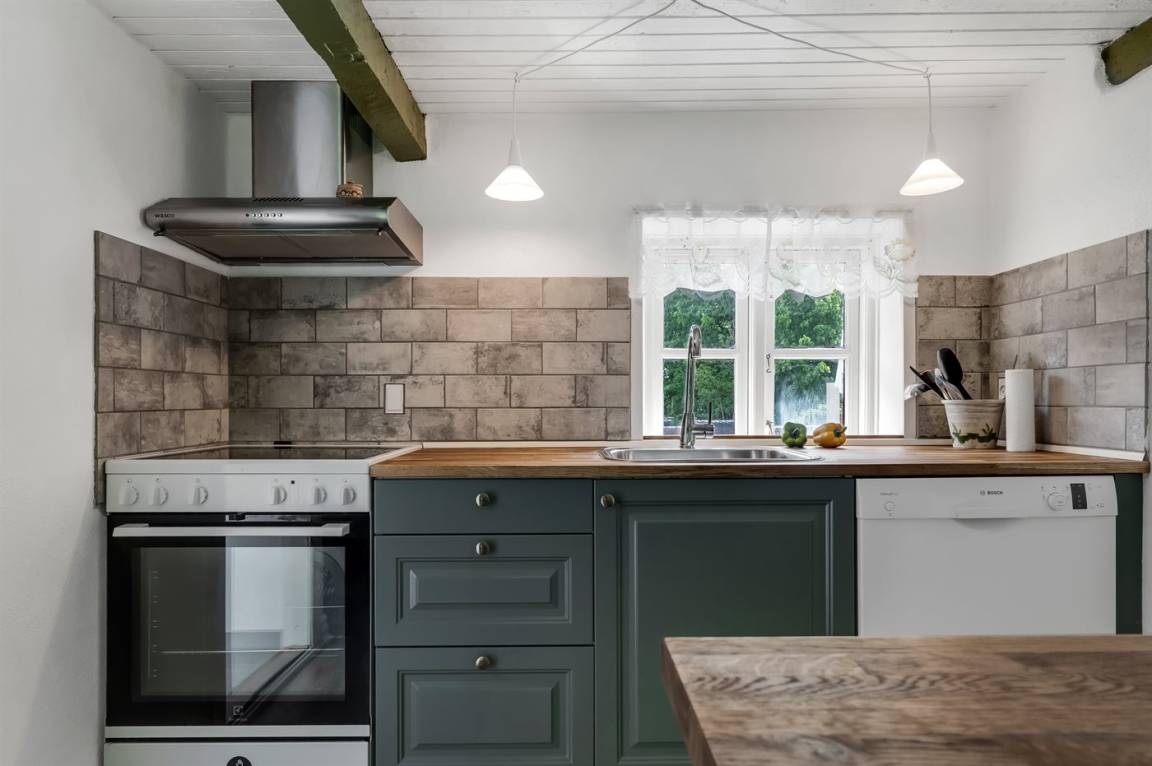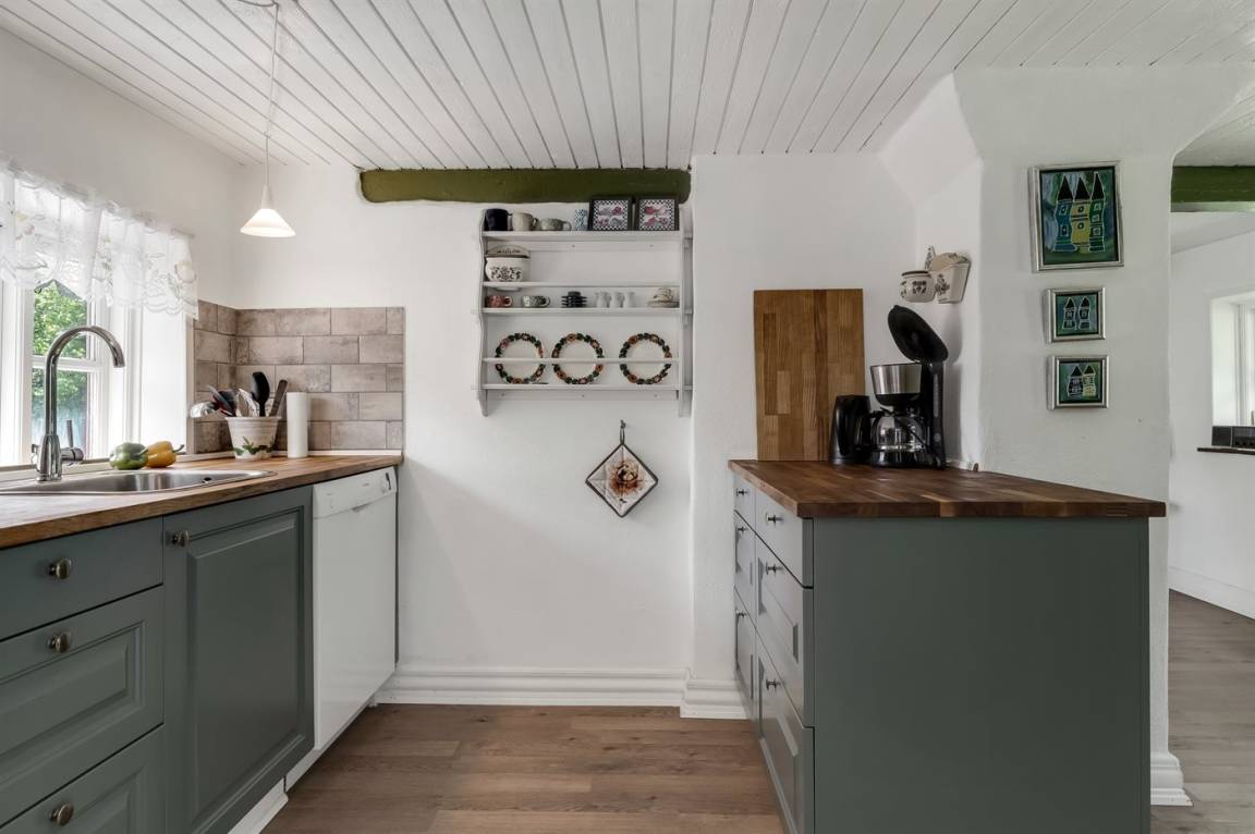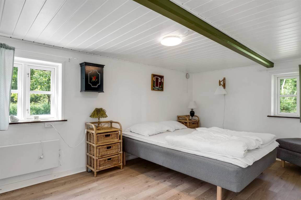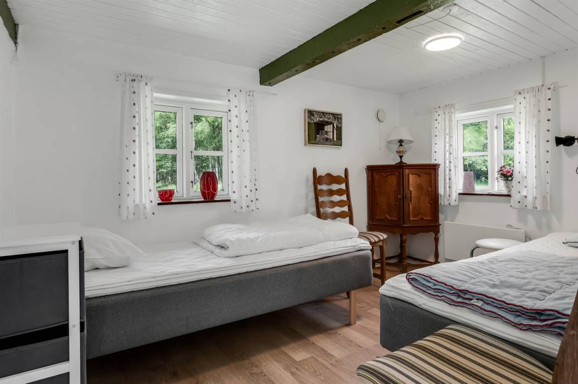 Das Ferienhaus liegt ungestört mit Wald und Feldern als nächster Nachbarschaft und mit reichlich Wildtieren in der Umgebung. Die Decken sind niedrig (175 cm), doch dafür wurde das Haus 2023 umfassend renoviert. Es verfügt über einen Eingangsbereich, ein Badezimmer mit Duschnische sowie eine Küche mit Essplatz, die offen in das Wohnzimmer mit Kaminofen und Wärmepumpe übergeht, sowie über zwei gute Schlafzimmer.