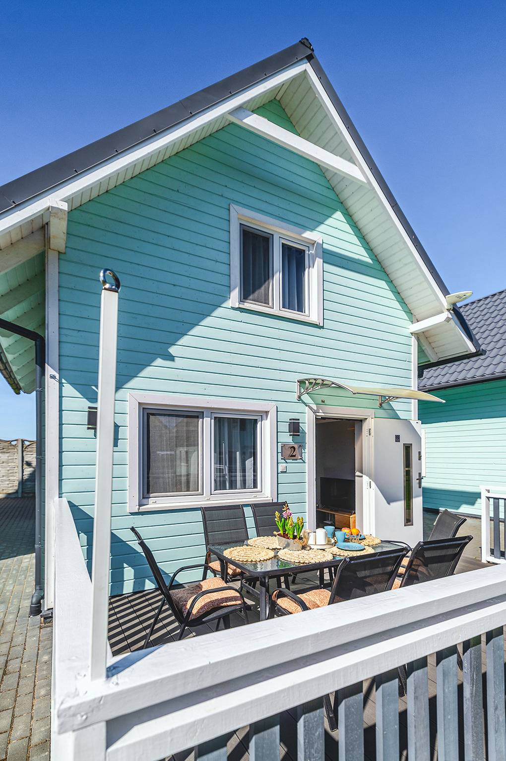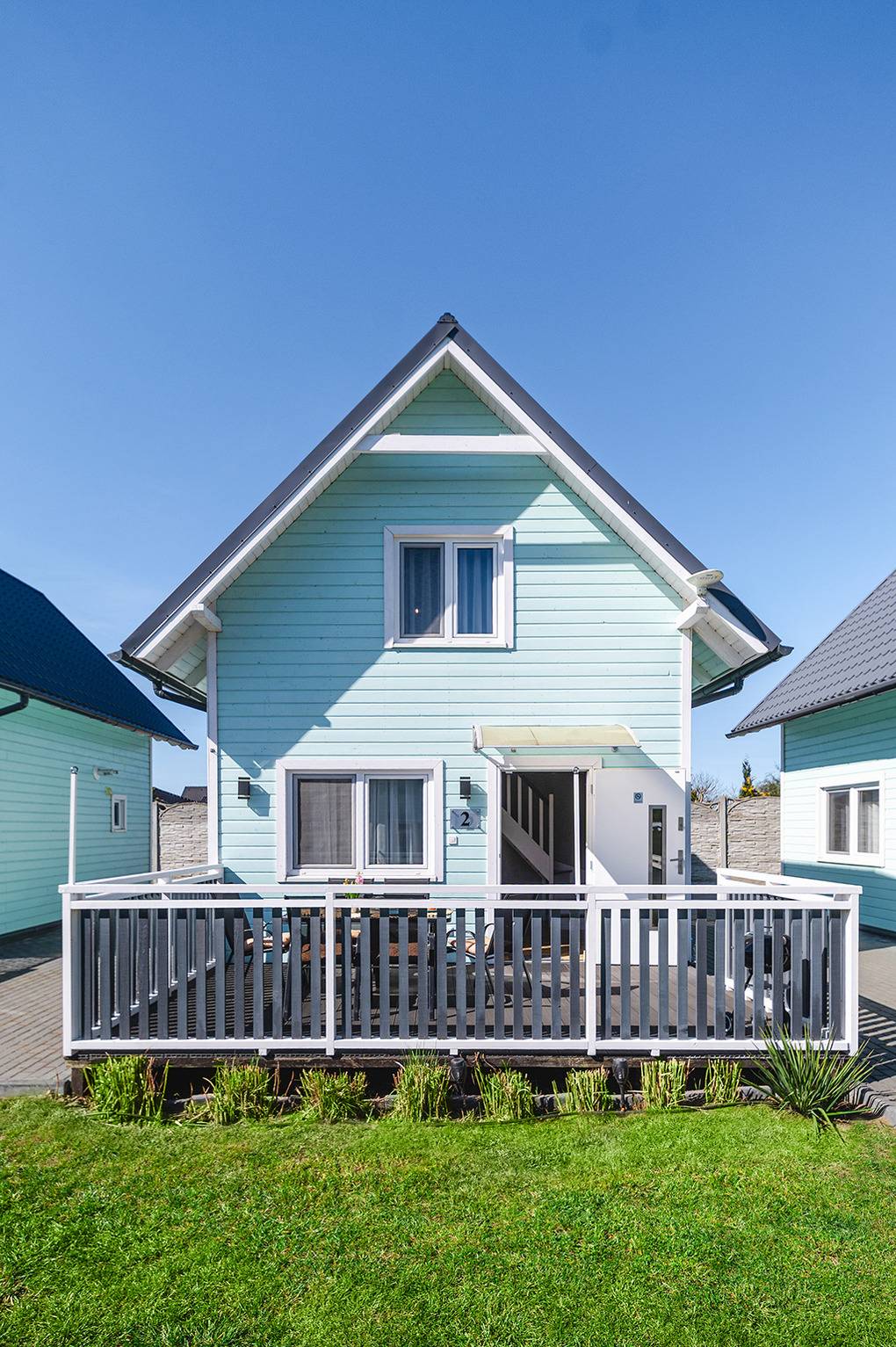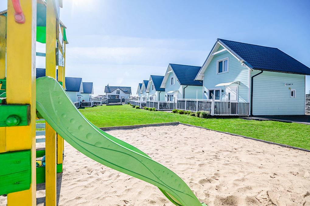 Haus: Schöne Ferienhausanlage mit acht komfortablen Holzhäusern auf einem umzäunten Grundstück. Nichtraucherhäuser. Moderne Einrichtung mit viel Liebe zum Detail. Kostenloses Internet über W-Lan. Spülmaschine. Zentralheizung. Terrasse mit Sitzmöbeln, Grill. Spielplatz mit Sandkasten, Klettergerüst, Rutsche, Schaukeln zur gemeinschaftlichen Nutzung. 2 Pkw-Stellplätze/Haus auf dem abgeschlossenen Grundstück.