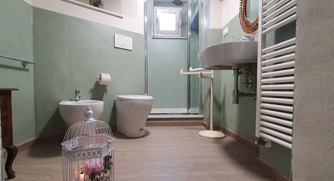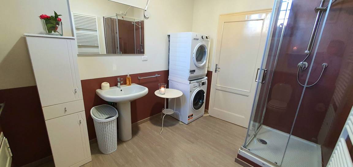 Badezimmer 1: Waschbecken, WC, Bidet, Dusche, Fön, Trockner, Waschmaschine.
