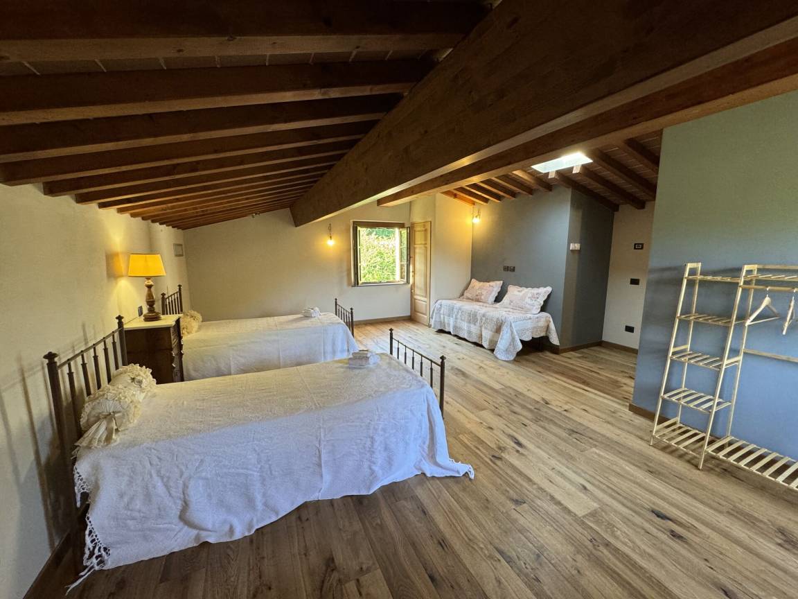 Schlafzimmer mit Bad: drei Einzelbetten, Klimaanlage, Waschbecken, WC, Bidet, Dusche, Fön, Badezimmer ohne Fenster.