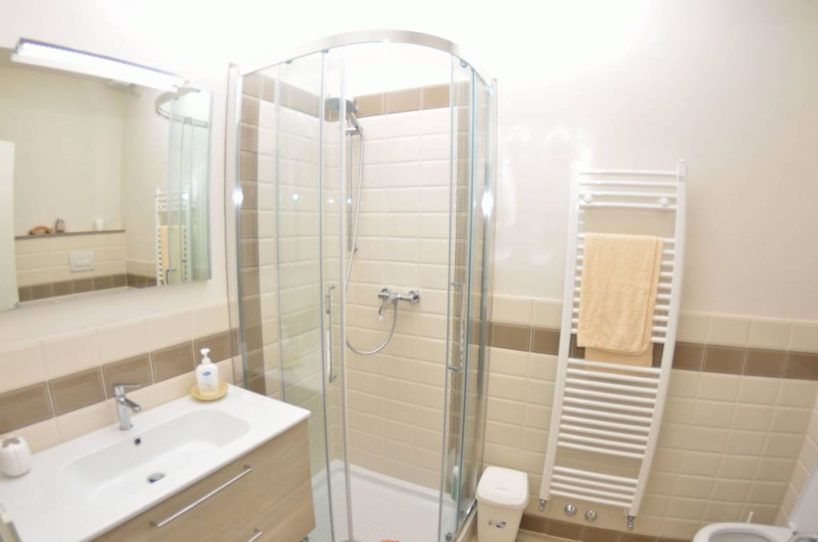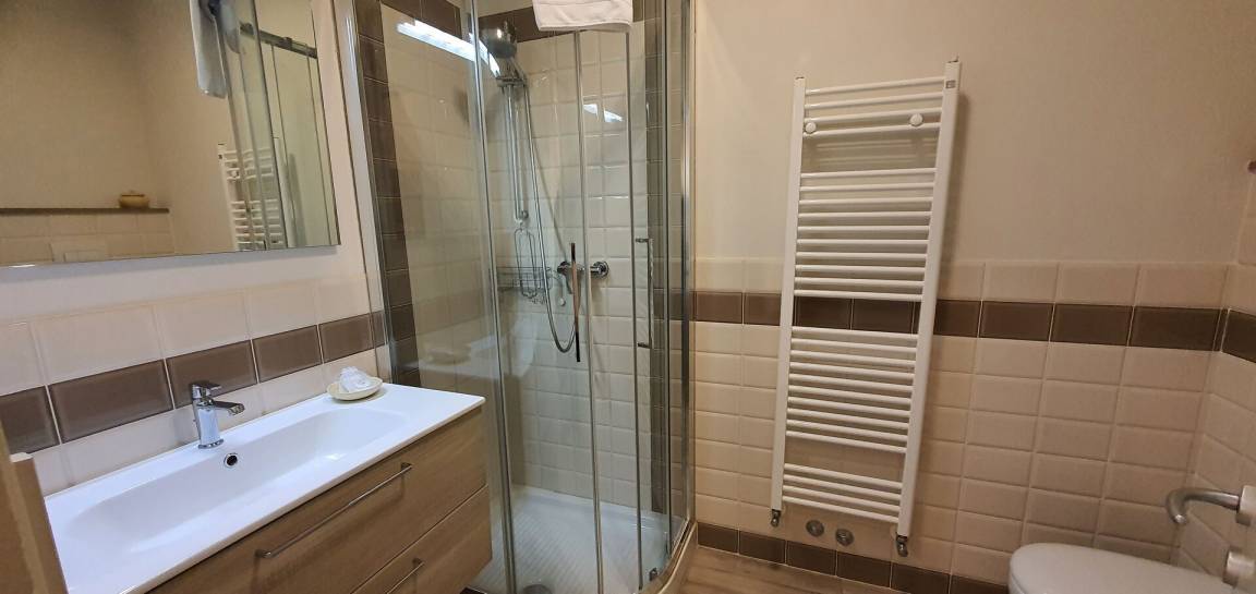 Badezimmer: Waschbecken, WC, Bidet, Dusche.
