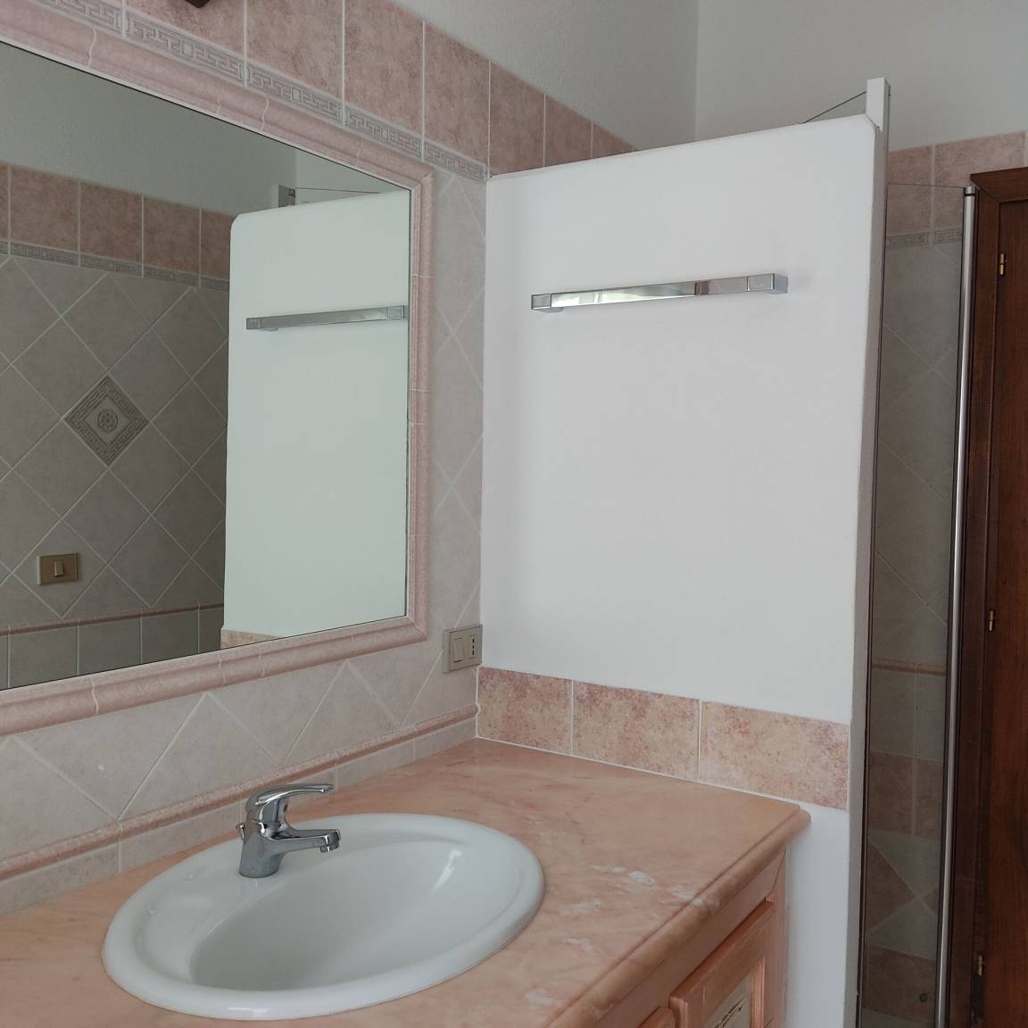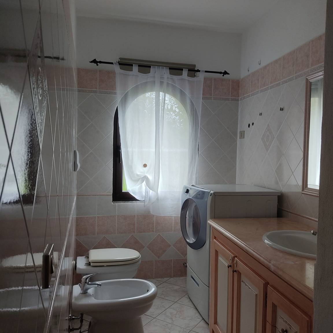 Badezimmer: Waschbecken, WC, Bidet, Dusche, Fön, Waschmaschine.