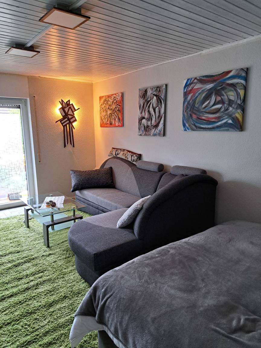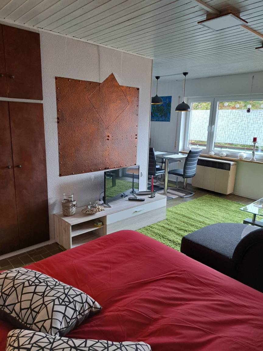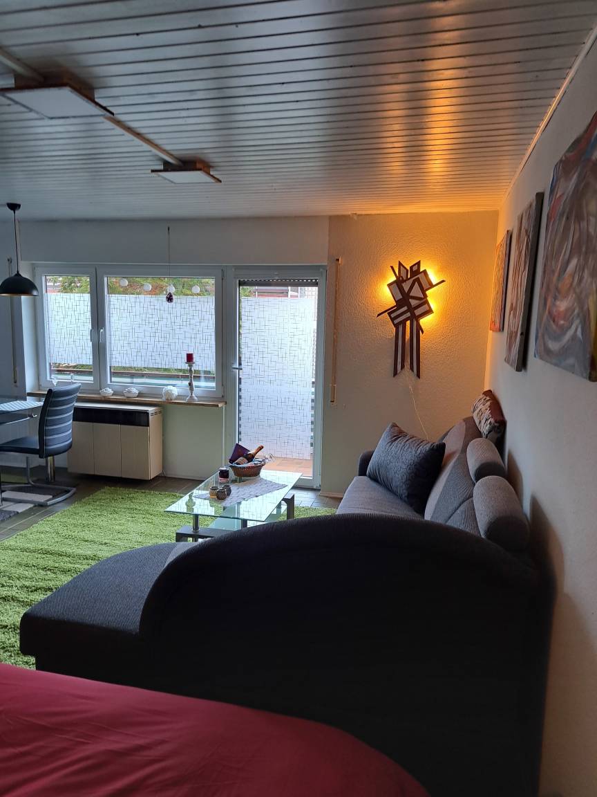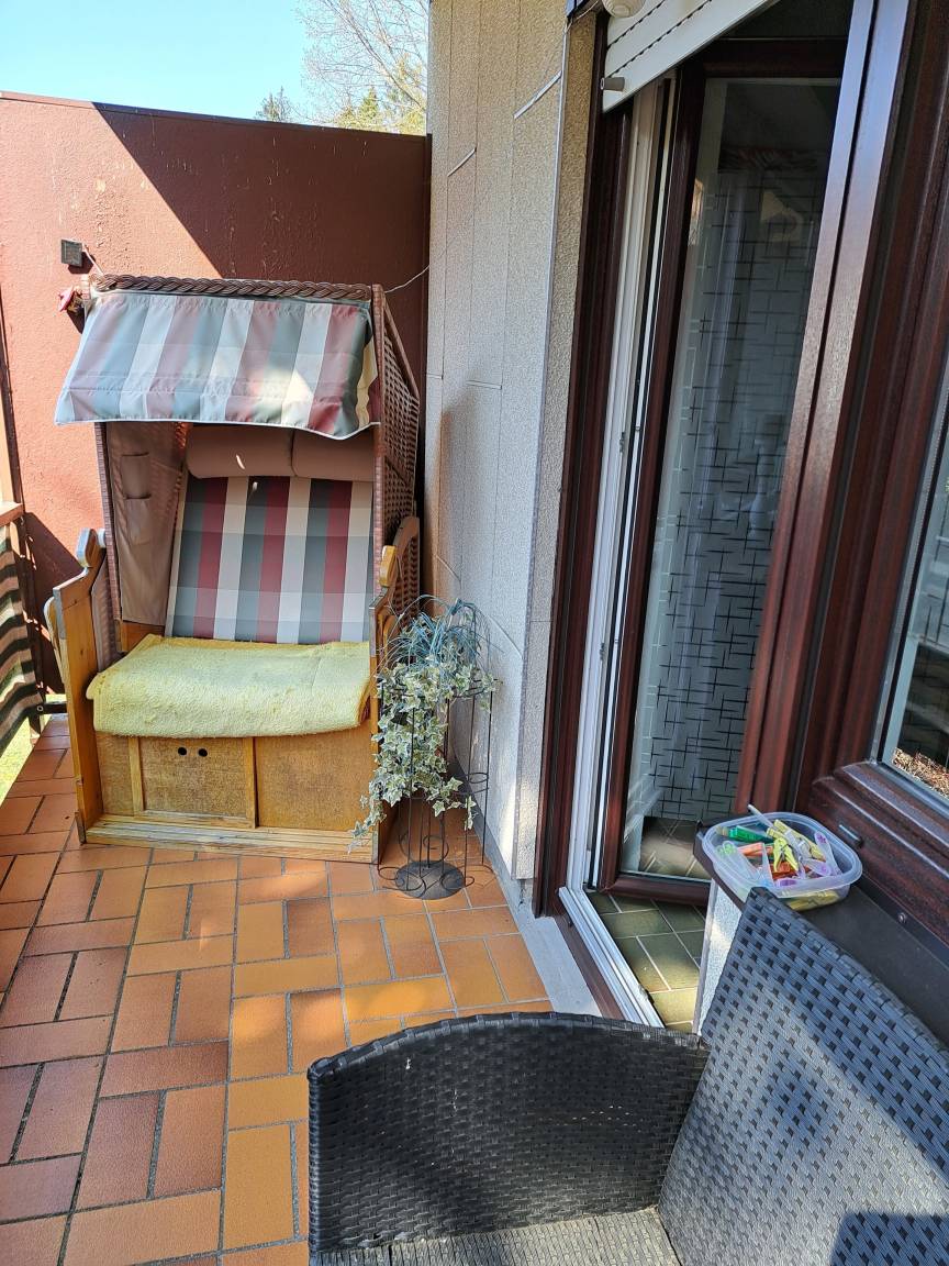Gemütlich und geschmackvoll zum Wohlfühlen eingerichtete Ein-Zimmer-Ferienwohnung mit Küchenzeile, Essbereich im 1.Obergeschoss mit großem überdachten Balkon inclusiv einem Strandkorb zum relaxen.