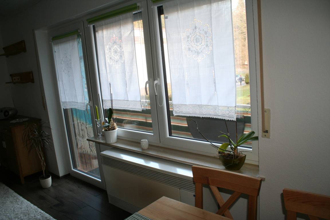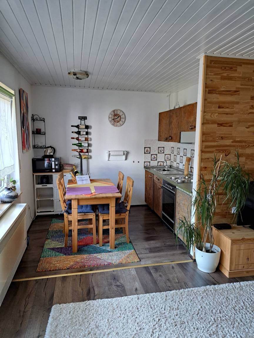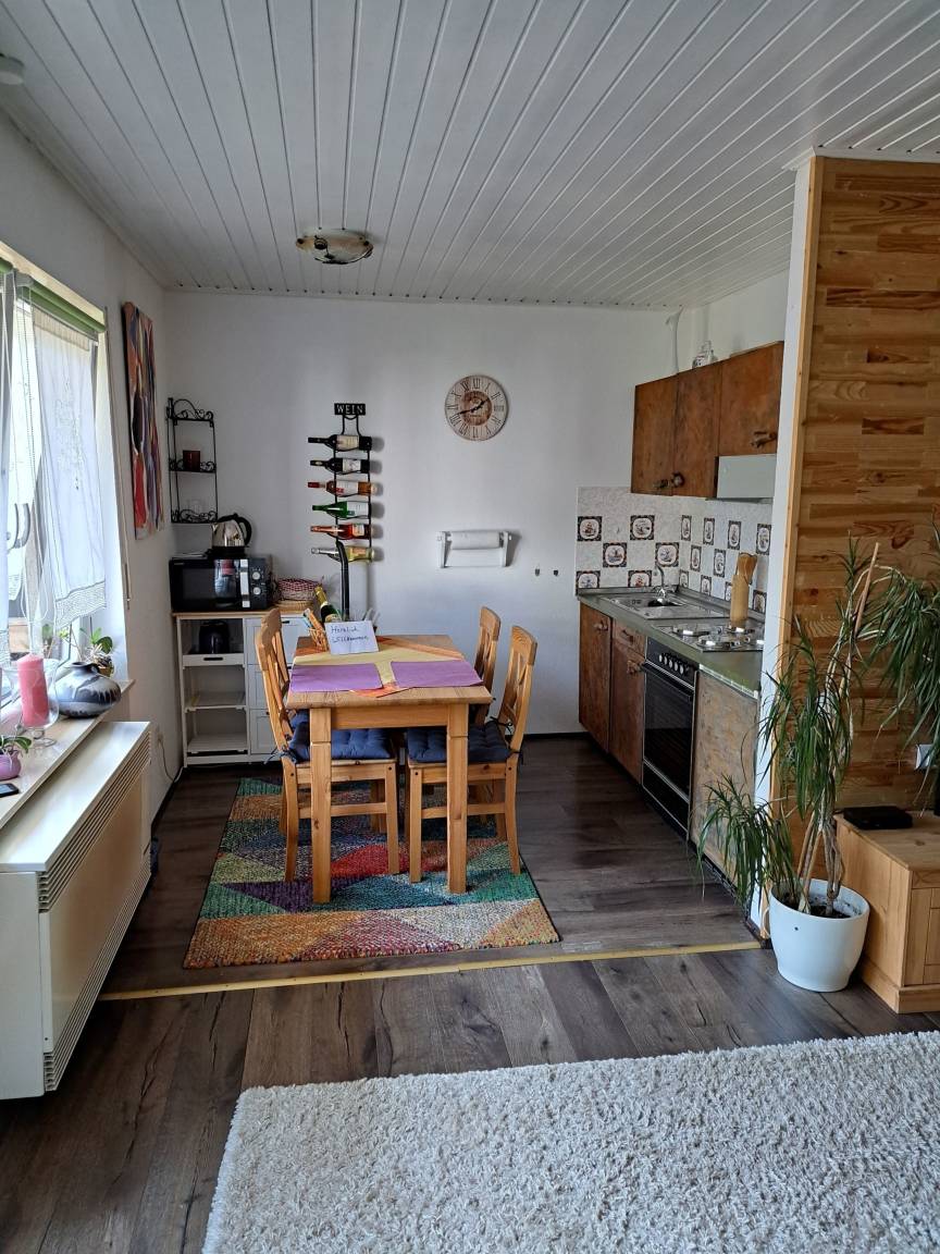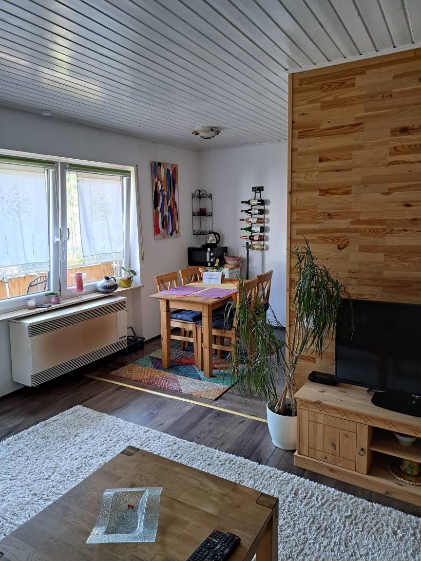 Neu renovierte und geschmackvoll zum Wohlfühlen eingerichtete Ein-Zimmer-Ferienwohnung mit Küchenzeile, Essbereich im 1.OG mit Balkon, sehr ruhig gelegen im Orteilsteil Schöntal direkt am Wald und 150 Meter vom Badeweiher Schöntal entfernt. Schöntal hat keinen Durchgangsverkehr, generell nur 30 kmStd. erlaubt.