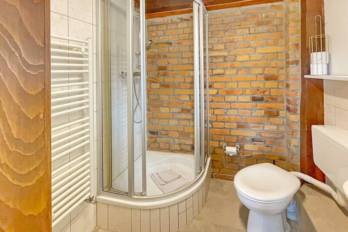 Die Ferienwohnung Rüster befindet sich in der 1. Etage. Sie ist unterteilt in Wohnzimmer mit Küchenzeile und einem separaten Schlafzimmer mit einem Doppelbett. Das Bad ist mit einer Dusche und WC ausgestattet.