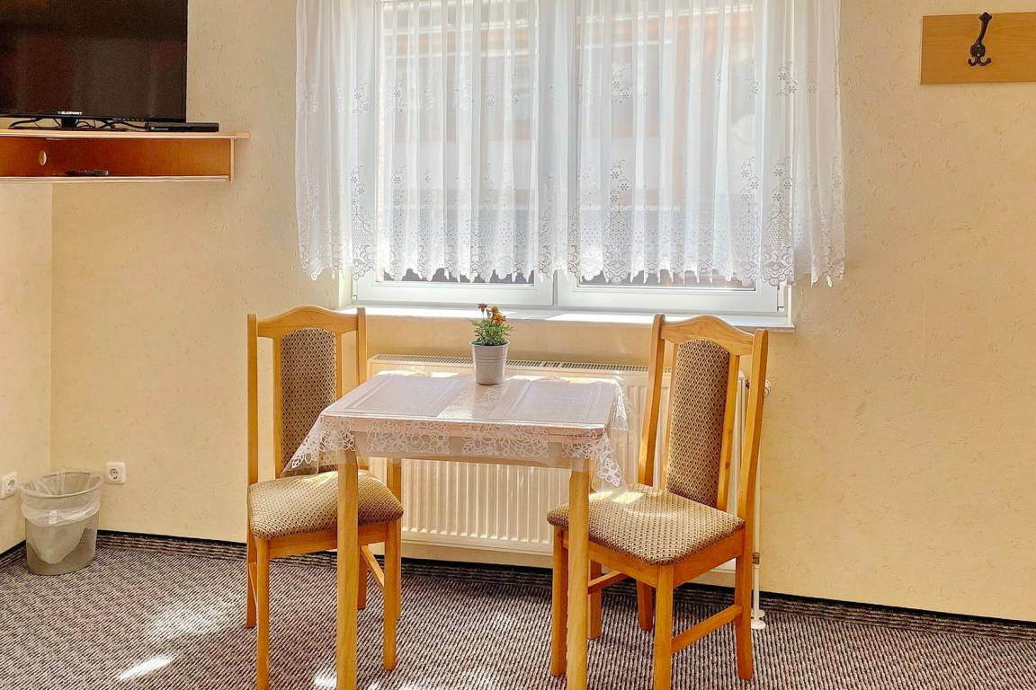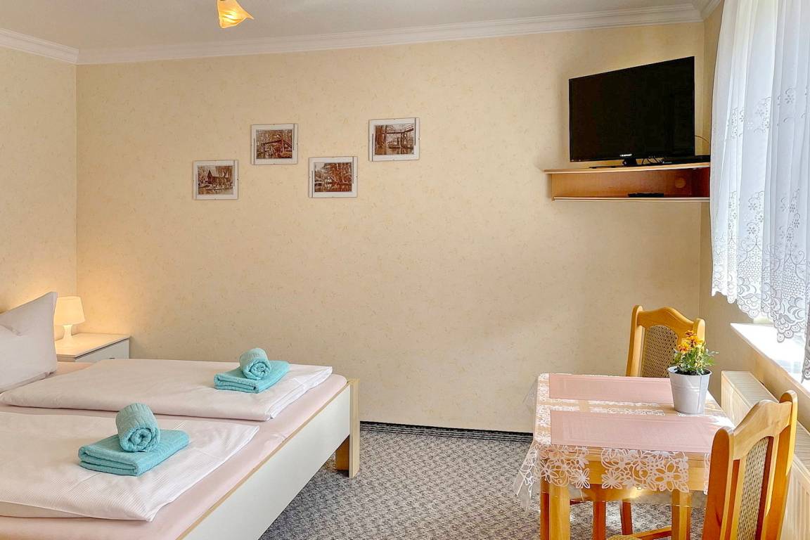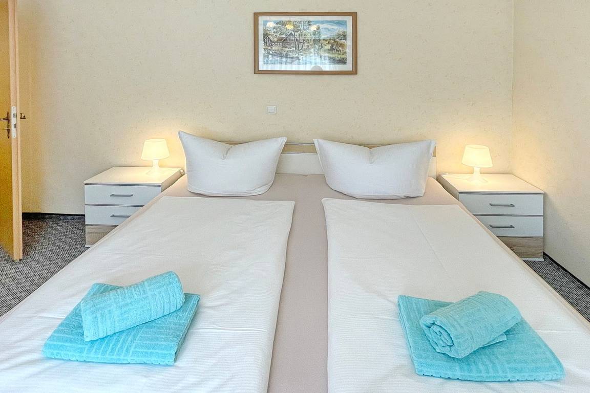 Die Schlafzimmer verstehen sich als Wohn-Schlafzimmerkombination und haben jeweils einen separaten Zugang zum Bad. Ein Schlafzimmer ist ausgestattet mit einem Esstisch und 4 Stühlen, einem Kleiderschrank und großem Flachbild-TV, sowie mit dem Bad mit Dusche/WC. Im Wohnzimmer befindet sich eine Schlafcouch mit Doppelbettfunktion, auch einem großem Flachbild/TV sowie das Bad mit Dusche/WC. Sie haben die Möglichkeit das Zimmer mit Außenjalousien zu verdunkeln. Im Vorflur befindet sich die Küchenzeile mit einem Wasserkocher, einer Kaffeemaschine, einem Kühlschrank, Geschirr und Besteck, sowie einer Microwelle und einem 2 Kochplattenherd.