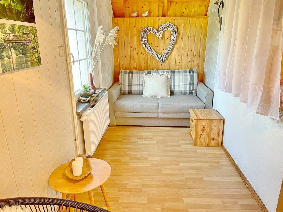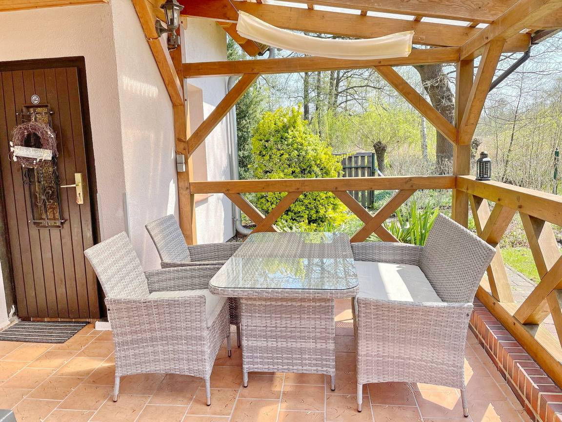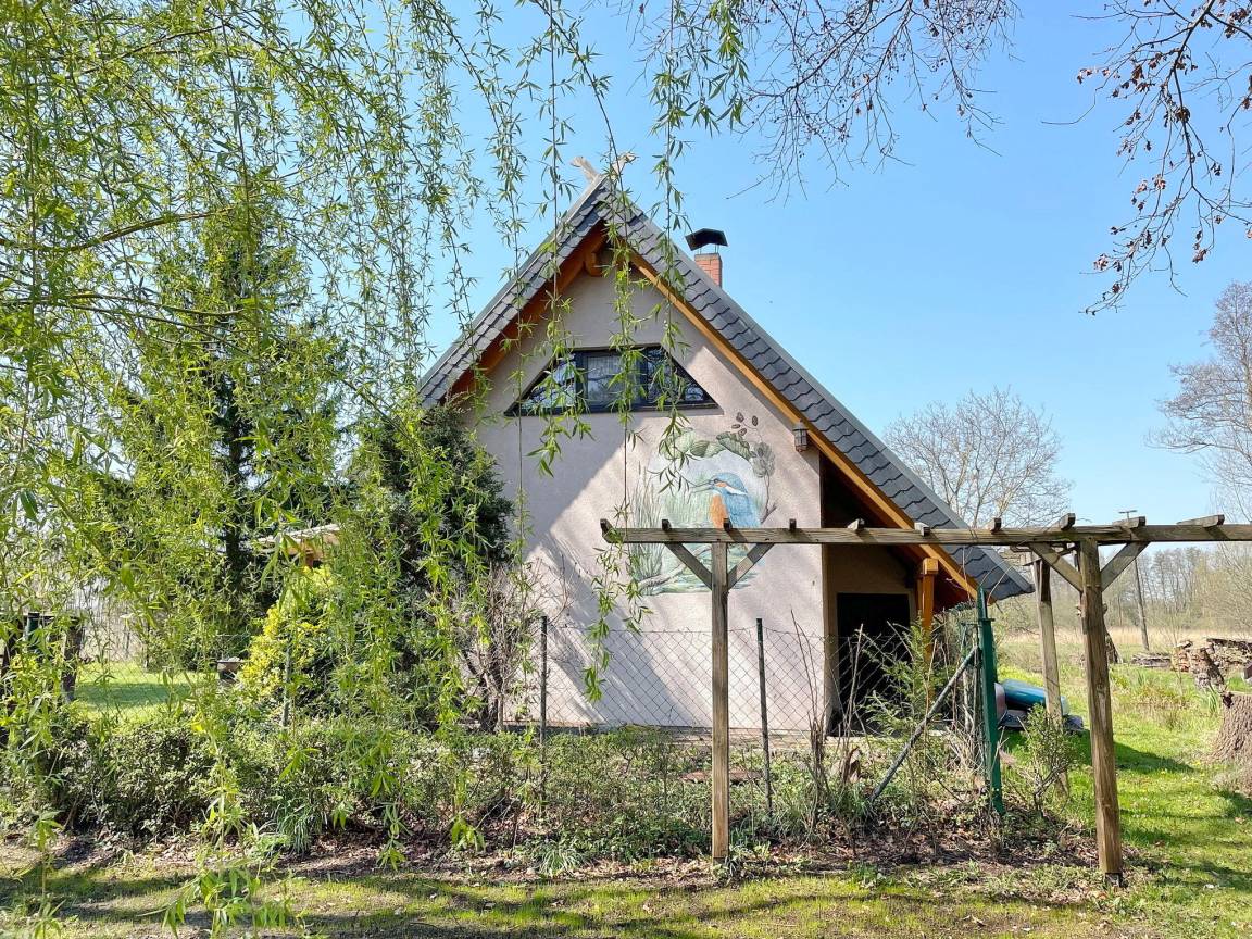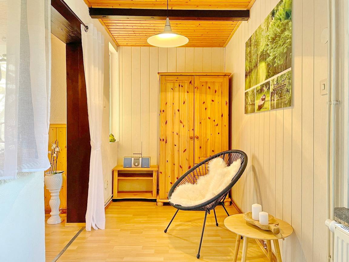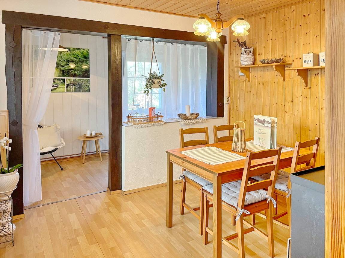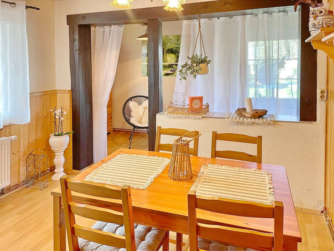 Das spreewaldtypische Haus hat eine überdachte Terrasse am Eingangsbereich, mit einem großen Esstisch und Bestuhlung. Der Flur ist kombiniert mit einer Küchenzeile (2 Platten-Herd, Abwaschbecken, Toaster, Kaffeemaschine, Wasserkocher und zahlreiche Küchenutensilien) und Zugang zum Esszimmer, mit Tisch und Sitzecke. Das Bad, mit Dusche und WC, sowie das offene Kinderzimmer befinden sich im Erdgeschoss. Das Schlafzimmer mit einem Doppelbett sowie einem Flachbild TV steht Ihnen im Obergeschoss zur Verfügung.