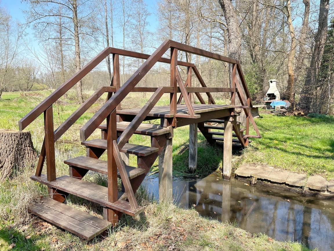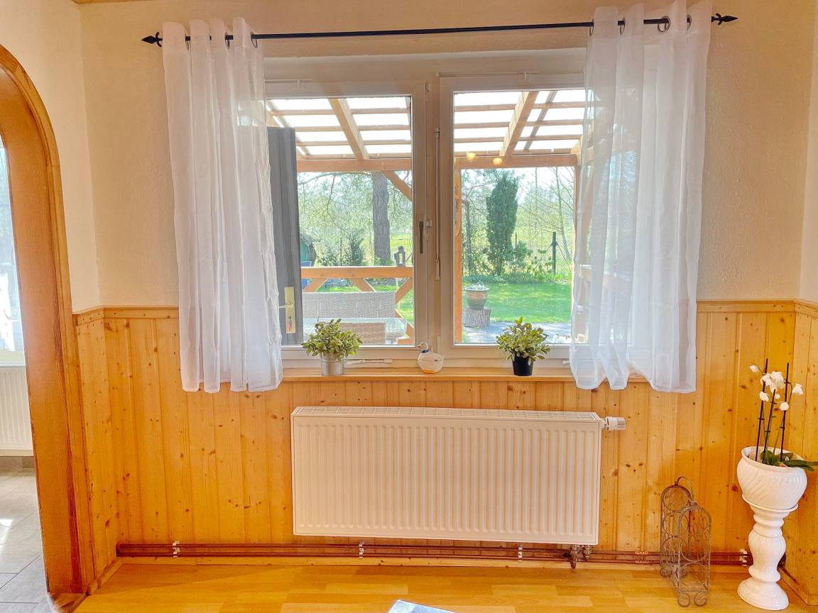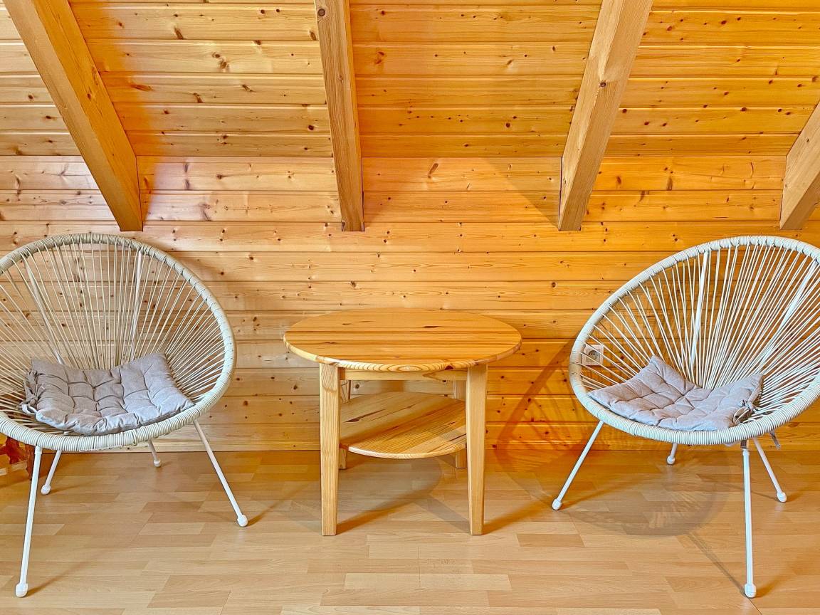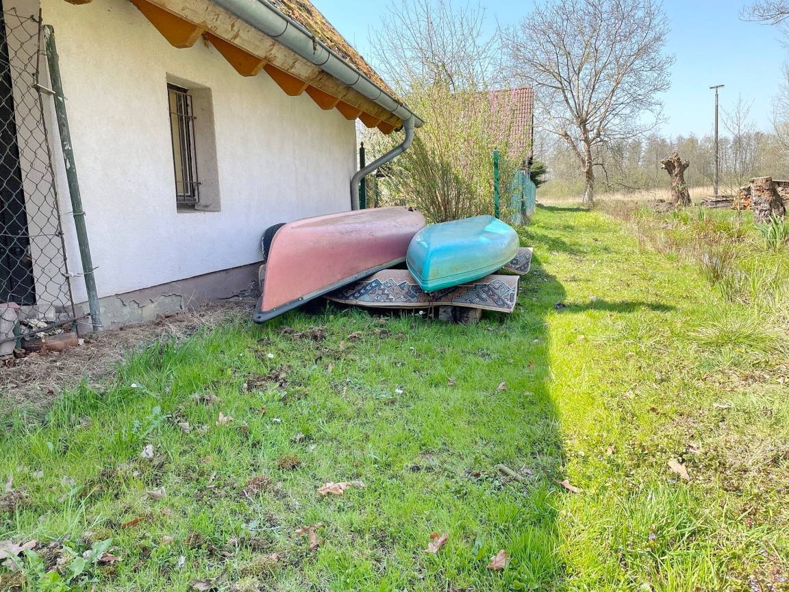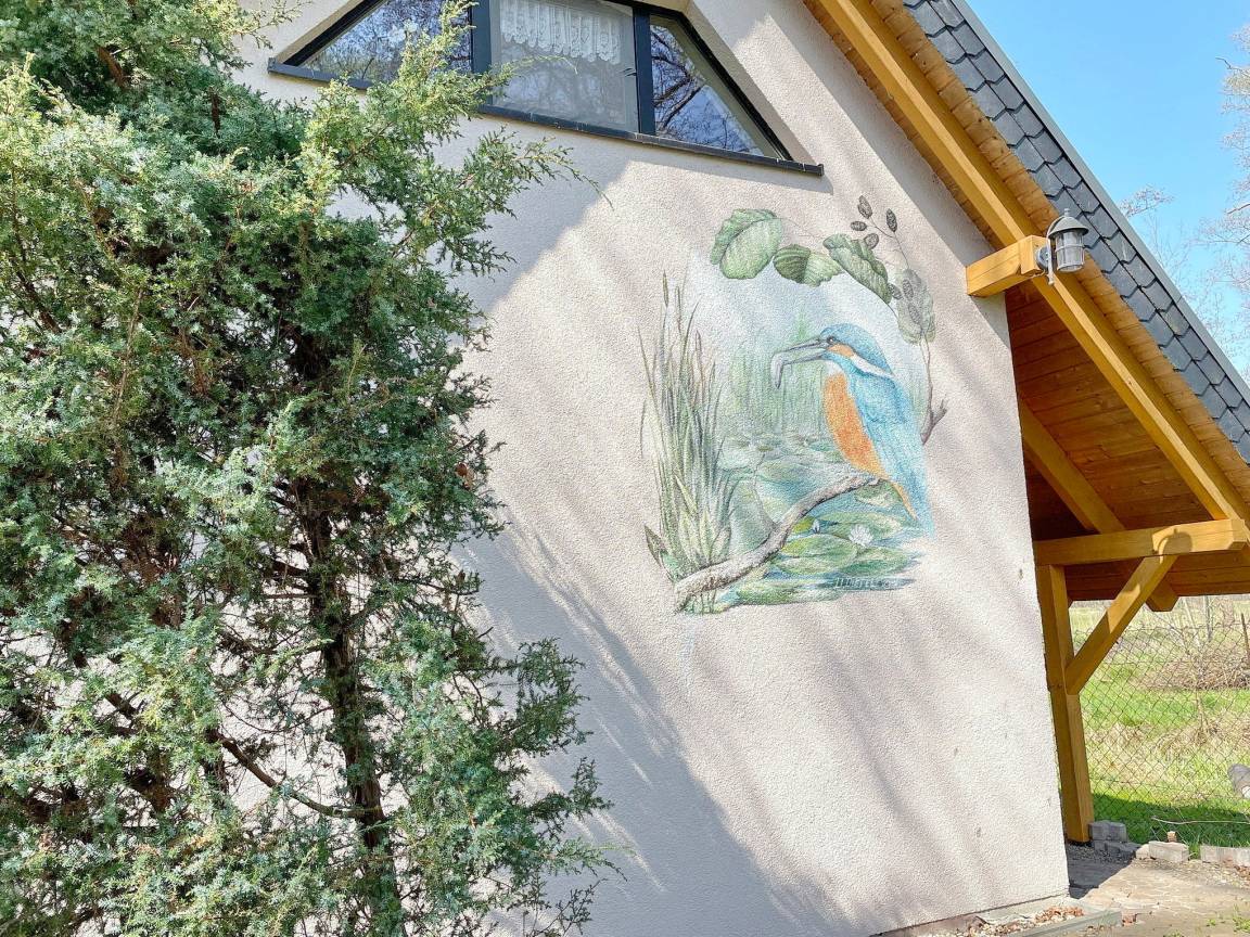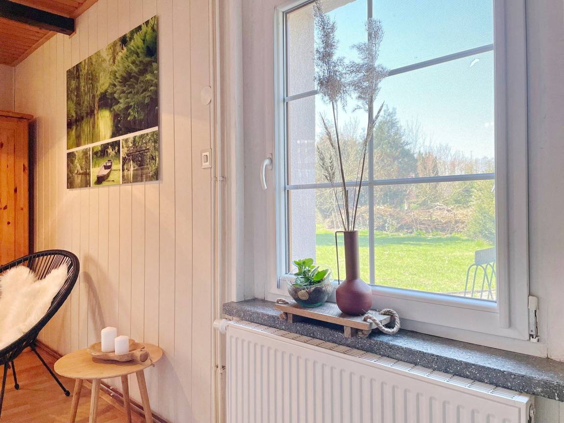 Das spreewaldtypische Haus hat eine überdachte Terrasse am Eingangsbereich, mit einem großen Esstisch und Bestuhlung. Der Flur ist kombiniert mit einer Küchenzeile (2 Platten-Herd, Abwaschbecken, Toaster, Kaffeemaschine, Wasserkocher und zahlreiche Küchenutensilien) und Zugang zum Esszimmer, mit Tisch und Sitzecke. Das Bad, mit Dusche und WC, sowie das offene Kinderzimmer befinden sich im Erdgeschoss. Das Schlafzimmer mit einem Doppelbett sowie einem Flachbild TV steht Ihnen im Obergeschoss zur Verfügung.