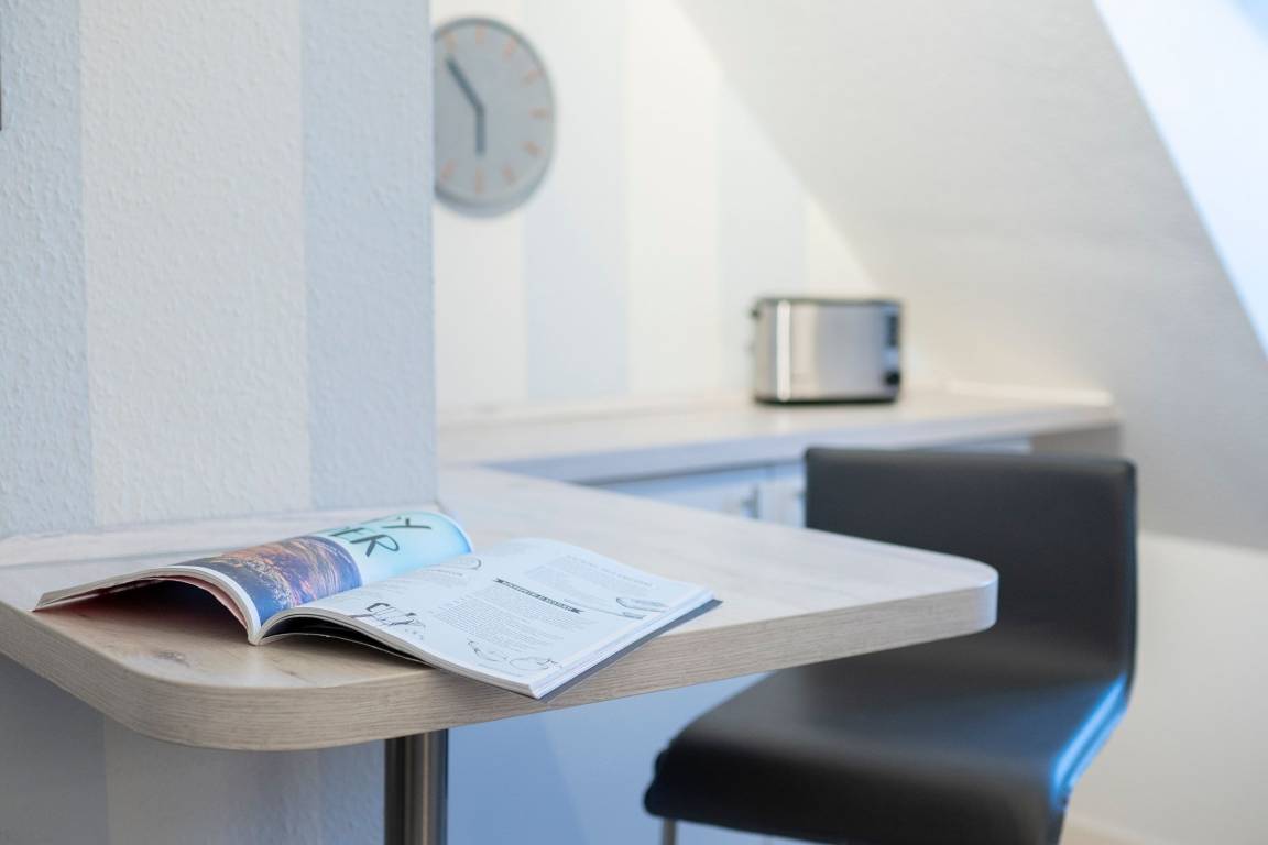 „Schöne Wohnung, hübsch eingerichtet, alles sauber, Bett gemütlich. Die Ausstattung der Küche ist hervorragend und reicht von 2 Kaffeemaschinen (für Kapsel- und Filterkaffee), Toaster, Wasserkocher über Geschirrspüler bis hin zu ausreichend Geschirr, so dass man nicht nach jeder Mahlzeit spülen muss. Trotzdem es eine Dachwohnung ist (die allerdings nur über Treppen erreichbar ist), ist es sehr hell. Die Lage ist top! Wir haben uns sehr wohl gefühlt! Ein bisschen teuer finde ich allerdings das Wäschepaket für 23,00? pro Paket.“