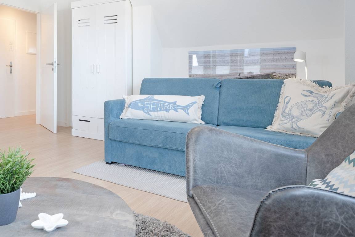 Nur noch einige Treppenstufen hinauf bis zur Eingangstür. Ein geräumiger Flur empfängt Sie. Geradezu ein gemütliches Wohnzimmer mit Essplatz und komfortablem Sofa mit Schlaffunktion (160x200 cm) lädt nach ereignisreichem Urlaubstag zum kuscheligen Beisammensein ein. Ein Flat-Screen TV sorgt am Abend für gemütliche Stunden. Über das Internet können Sie Ihre Erlebnisse mit den Freunden teilen. Spaß macht das gemeinsame Kochen in der vollwertig ausgestatteten Küche mit einer Sitzgelegenheit , es wird Ihnen hier an nichts fehlen. Das modern eingerichtete Schlafzimmer erreichen Sie vom Flur. Ein Boxspringbett (180x200 cm), Nachttische auf jeder Bettseite mit Nachttischlampen ein Kleiderschrank und ein weiterer Flat-Screen TV gehören zur Ausstattung. Nach ausgiebigen Spaziergängen nur einmal kurz die Beine hoch legen oder ganz entspannt dem Fernsehprogramm aus dem bequemen Relaxsessel folgen. Gardinen und Verdunkelungsplissee schützen vor den ersten Sonnenstrahlen. Das Duschbad mit Föhn und WC rundet den Anspruch dieser Ferienwohnung ab. Außerdem sorgen die schrägen Wände für ein heimeliges Gefühl.