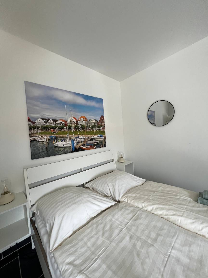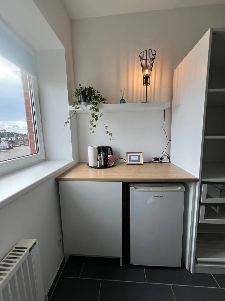 Die Zimmer sind mit einem geräumigen Kleiderschrank inklusive ausziehbarem Schuhregal und großen Schubladen eingerichtet . Die Sitzecke bietet einen individuell beleuchteten Rückzugsort mit Aussicht auf den Hafen. Der Essplatz ist als Tresen gestaltet und bietet Ausblicke auf die Trave. Ein schönes Doppelbett mit hochwertiger Matratze (zwei Härtegrade) komplettiert die Einrichtung. Im Zimmer befinden sich Kühlschrank und Wasserkocher sowie Geschirr.