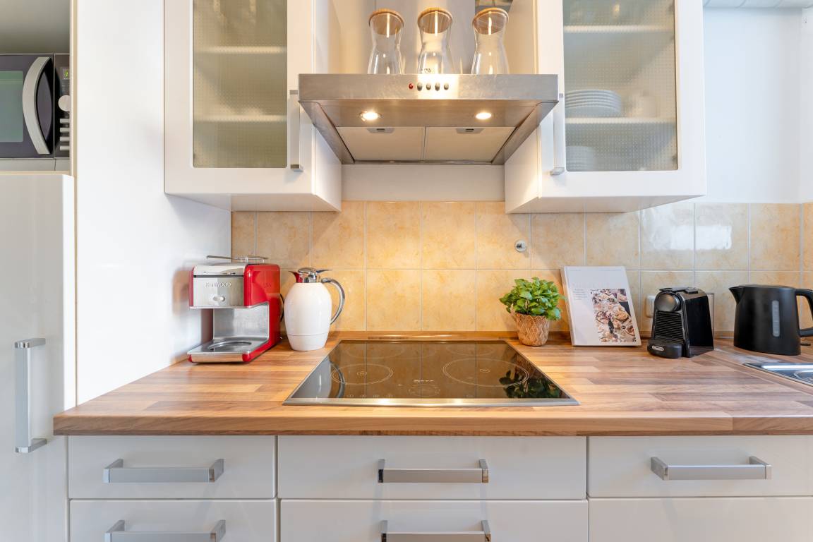 Die separate Küche ist funktional und komfortabel ausgestattet: Ein Induktionsherd mit vier Kochfeldern, Backofen, Geschirrspülmaschine, Kühlschrank mit Gefrierfach, zwei Kaffeemaschinen (Filter & Nespresso) sowie ein Toaster bieten beste Voraussetzungen für gemeinsame Kochabende. Ein Essplatz lädt dazu ein, die Mahlzeiten in geselliger Runde zu genießen. Das Schlafzimmer verfügt über ein Doppelbett sowie ein Etagenbett und bietet somit angenehme Rückzugsmöglichkeiten für erholsame Nächte. Das moderne Badezimmer ist mit Badewanne mit Duschfunktion, WC, Waschbecken und Haartrockner ausgestattet und rundet den Wohnkomfort ab.