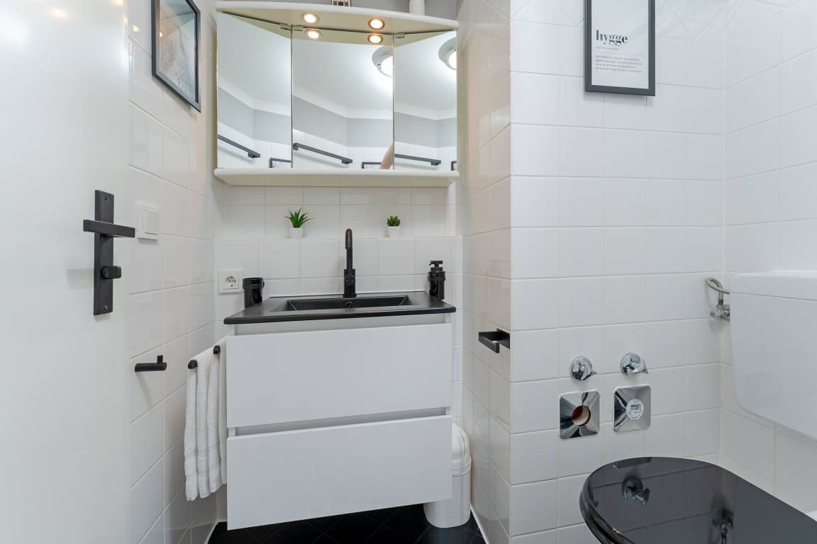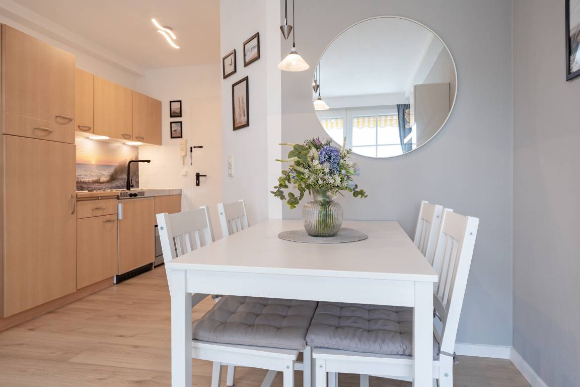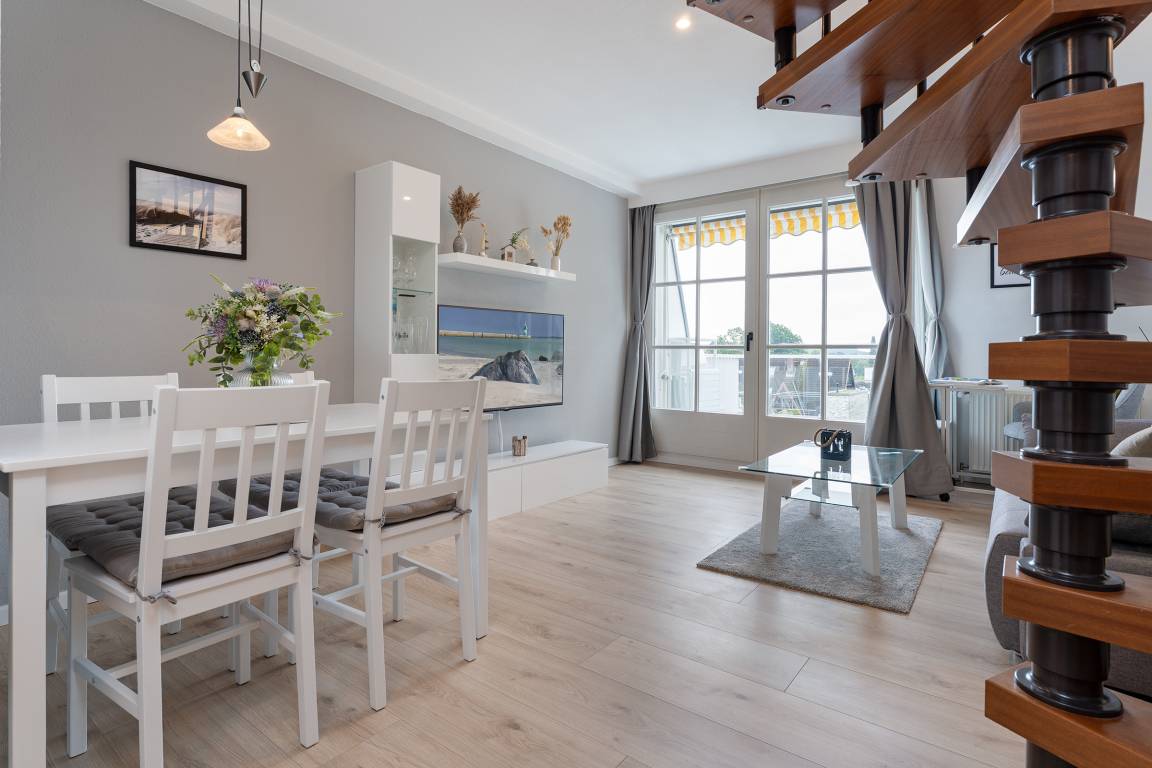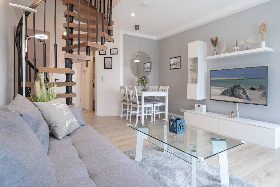 Der Wohnbereich, der zusätzlich über ein Schlafsofa für zwei Personen verfügt, bietet Ihnen Unterhaltung mit einem Radio oder dem TV. In der angrenzenden Küchenzeile bleiben keine Wünsche offen - Eierkocher, Kaffeemaschine und Toaster bilden die Grundlage für ein tolles Frühstück. Über die Treppe gelangen Sie zu den Schlafbereichen. Das Hauptschlafzimmer verfügt über ein großzügiges Doppelbett und das kleine Schlafzimmer, das nur durch eine Schiebetür getrennt ist, verwöhnt zwei Gäste mit je einem Boxspringbett. Frisch in den Tag starten Sie im funktionalen Badezimmer mit Dusche und Haartrockner. Das Highlight der Wohnung ist der Balkon mit Südausrichtung, Sonnenliegen und Markise - hier lässt sich der Urlaubstag wunderschön abschließen. In den Wintermonaten können Sie von hier aus sogar die wunderschöne Ostsee glitzern sehen.