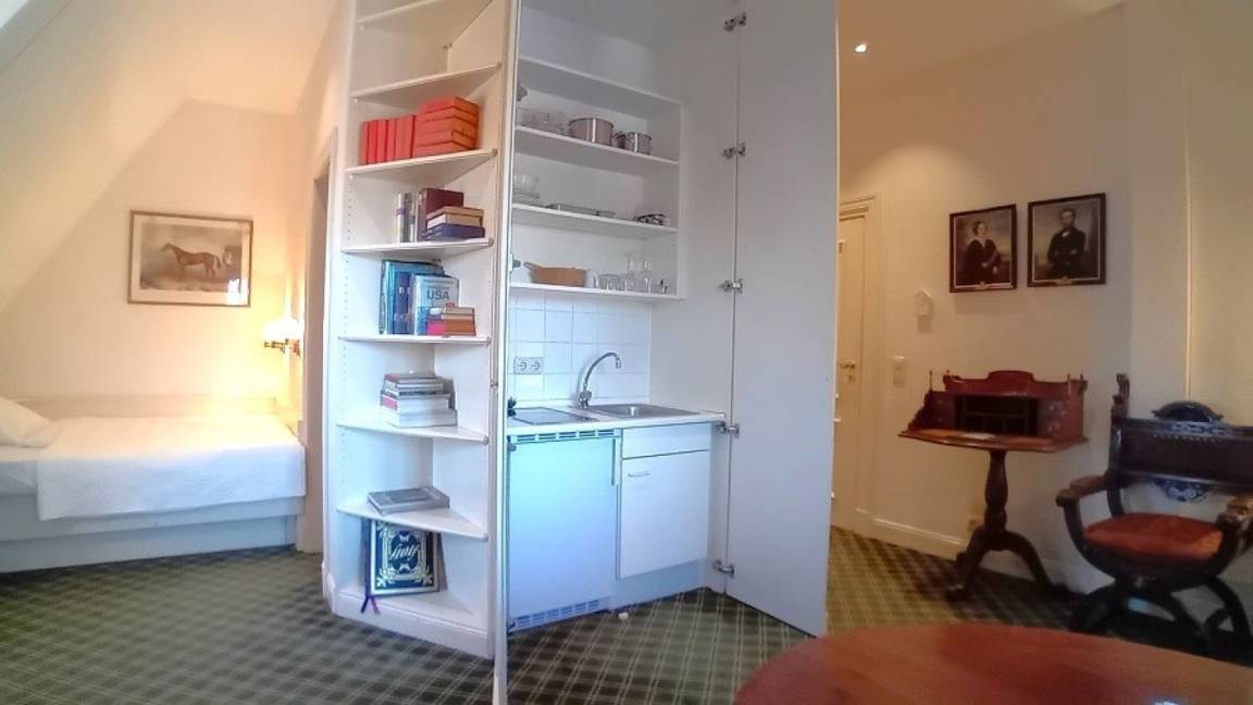 Das gemütliche Appartement im Schloss Lüdersburg bietet Komfort in einem stilvollen Wohn-/Schlafbereich. Ein Einzelbett sorgt für erholsamen Schlaf. Die Küche ist mit allem Notwendigen ausgestattet. Ideal für eine Person, die eine charmante Unterkunft mit historischem Flair sucht.