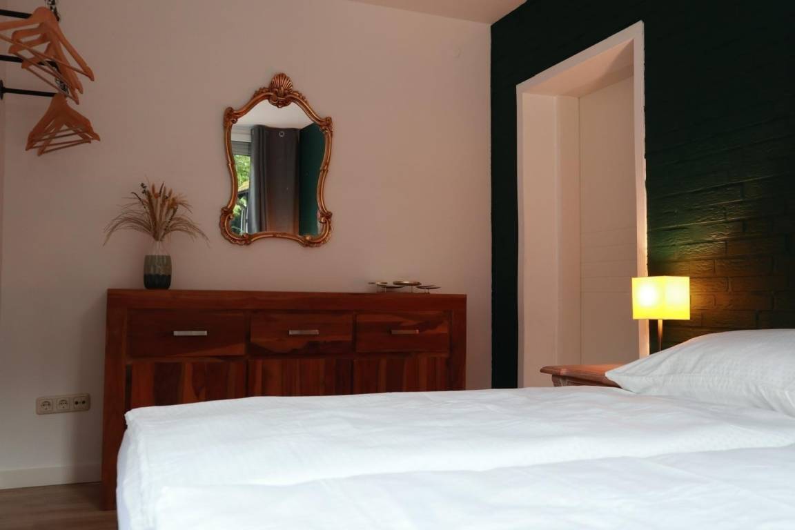 Die Ferienwohnung vereint modernen Komfort mit künstlerischem Charme. Zwei Schlafzimmer und ein vielseitig nutzbarer Wohnbereich bieten Platz für bis zu 6 Personen. Eine großzügige Küche, ein Bad mit Wanne, Gäste-WC, Waschmaschine, Trockner, Spülmaschine und kostenfreies WLAN gehören zur Ausstattung. Die Terrasse, der Hof und drei private Parkplätze stehen den Gästen offen. Ihre Haustiere sind willkommen.