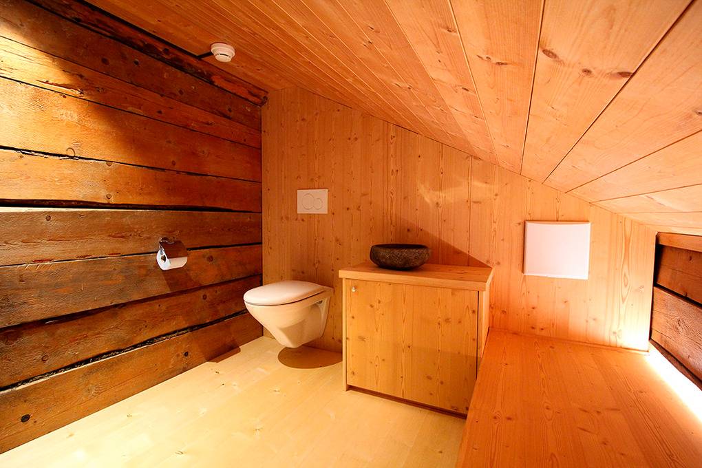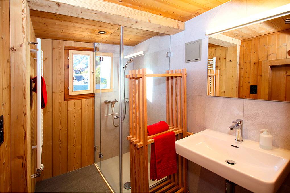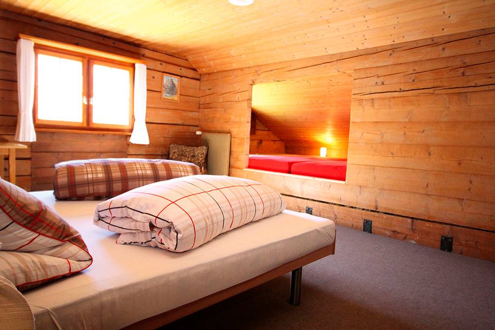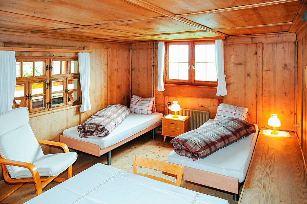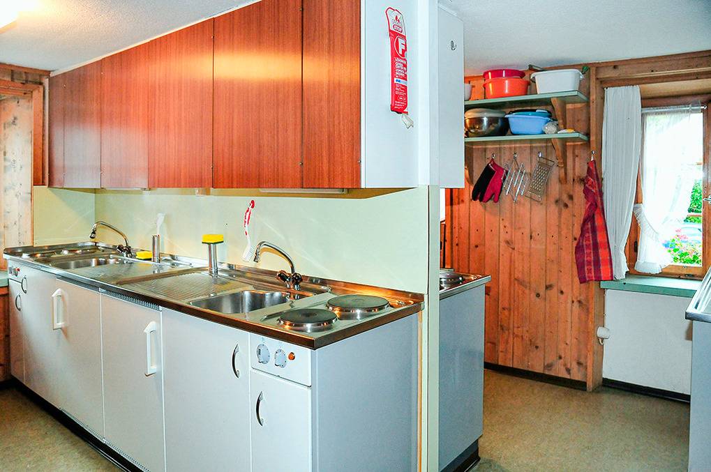 Parterre: Eingangsbereich mit rundem Tisch, Garderobe. Essraum für 14-16 Personen. Wintergarten (traditionelle Laube) mit weiteren Esstischen, großer Fensterfront, schönem Berg- und Talblick. Küche mit mehreren Kochnischen (E-Platten, Backofen). Doppelzimmer. 3-Bettzimmer, dahinter: 2-Bettzimmer. Bad: Bw/Du, Wb, WC. Separates WC.