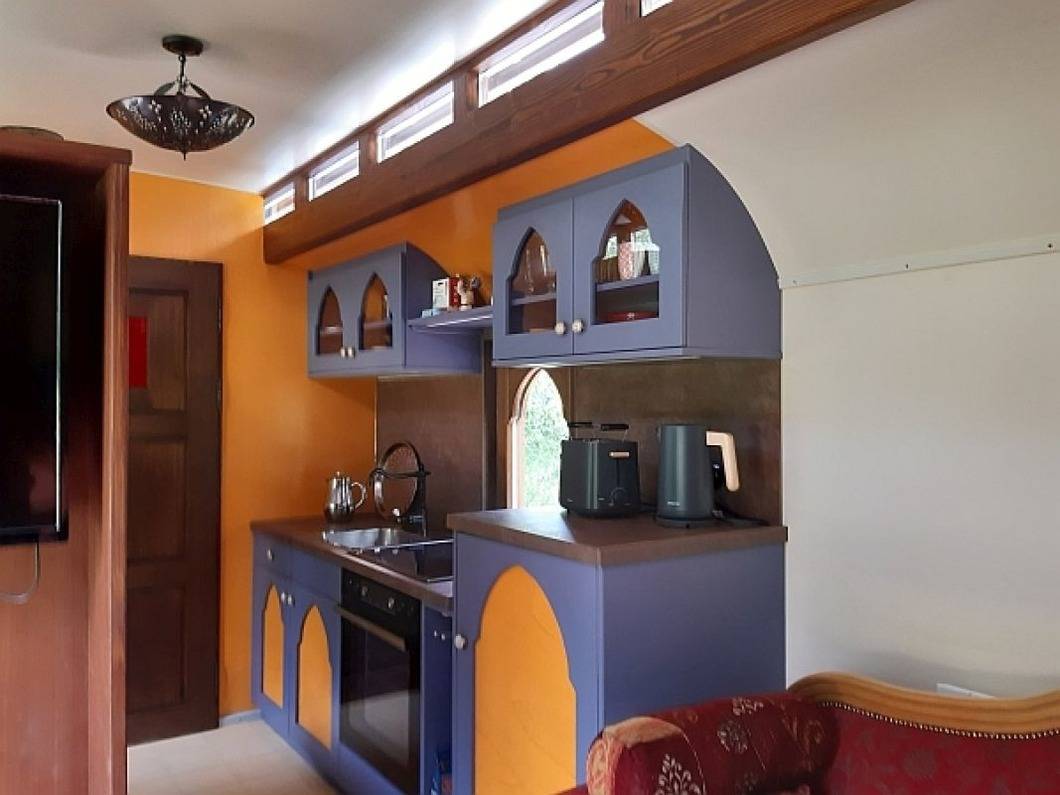 Nostalgisch ist der Wagen schon, aber Fußbodenheizung unter marokkanischen Fliesen, dezente Heizkörper, ein Bad mit allen Annehmlichkeiten und eine Küchenzeile bieten Ihnen durch und durch gegenwärtigen Komfort. Zigappo orientale hat sogar einen eigenen Soundtrack.