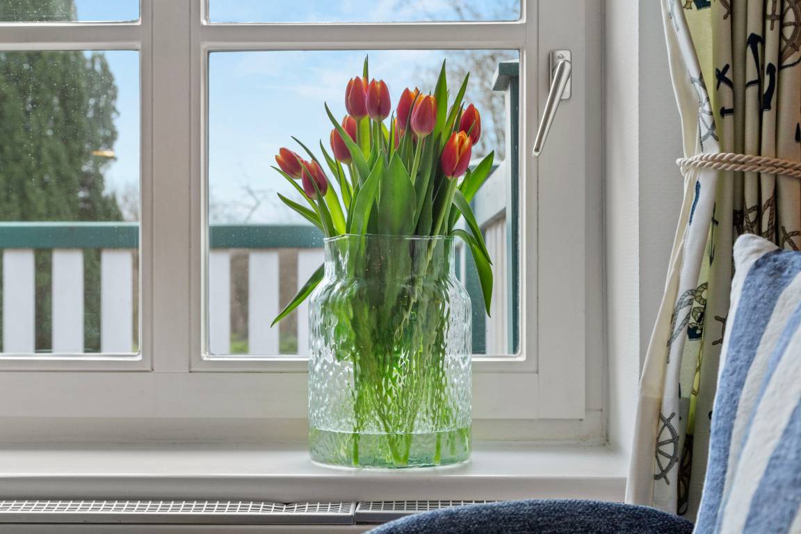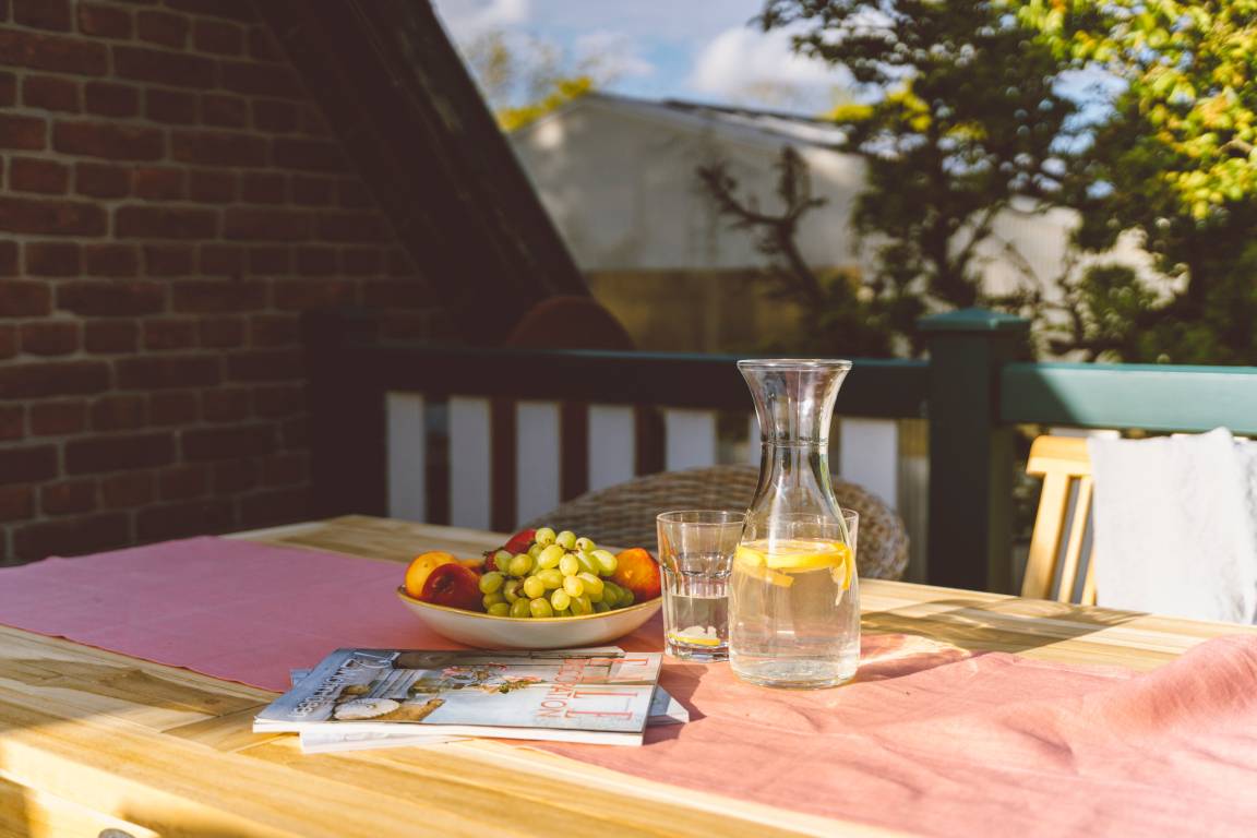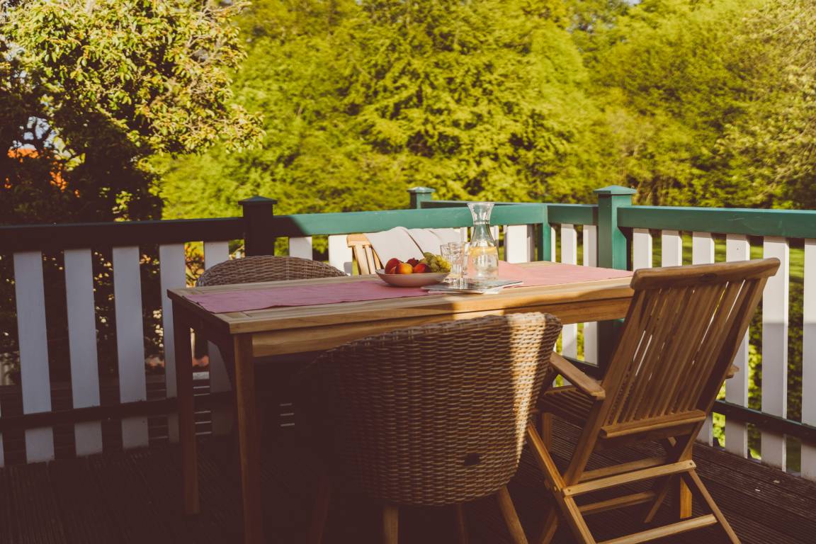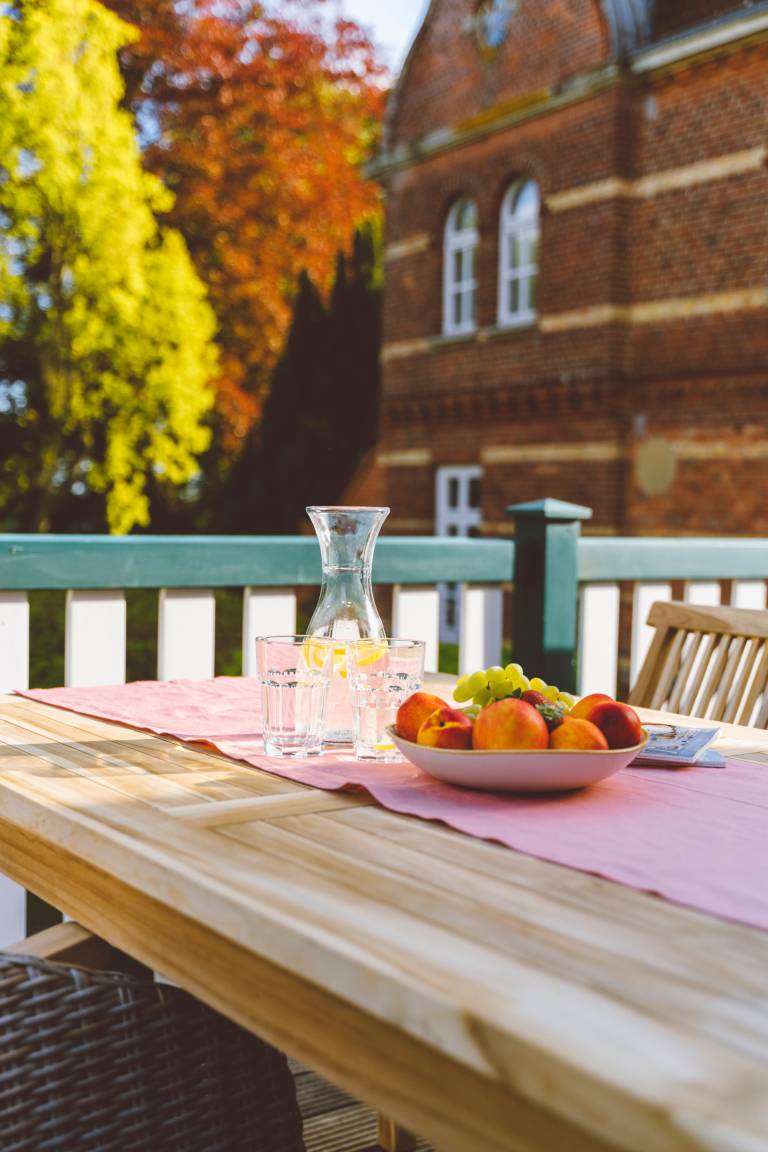 Stilecht für Ihren Urlaub: Ein eigener Strandkorb auf dem Balkon, um zu zweit darin zu sonnen oder zu lesen. Die Möblierung lädt an schönen Tagen auch zum Frühstück oder Mittagessen nach draußen ein. Mit Süd-Blick auf den Gutspark. Oder machen Sie es sich im Wohn- und Essbereich heimisch.