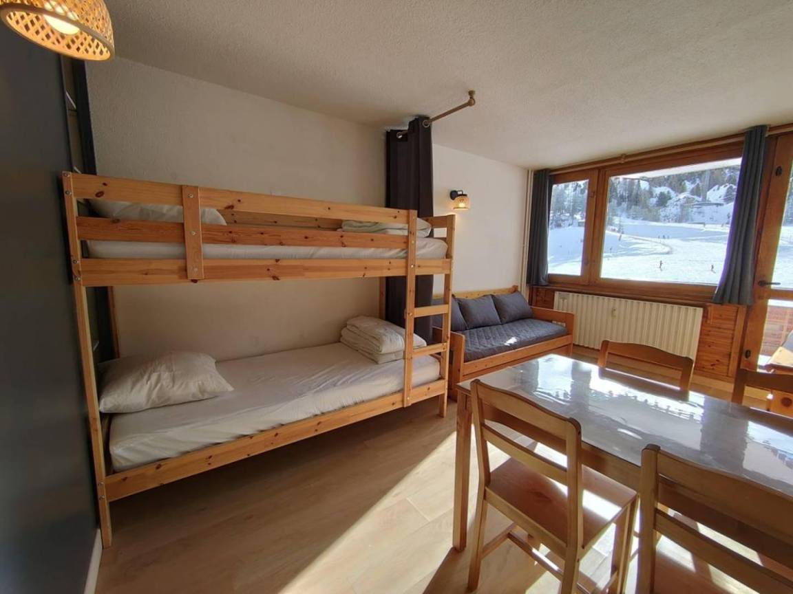 Die Residenz Le France befindet sich in der Station La Plagne in den französischen Nordalpen. Sie ist eine Station Skiern an den Füssen. Sie profitiert von einer außergewöhnlichen Stelle, in der Nähe des Kinderhorts, der Skischule und des Zentrums der Station. Direkter Zugang mit der Innenpassage. Vom Balkon ihrer Wohnung werden Sie eine schöne Sicht auf den Skispisten und dem Montblanc haben. Fläche von ungefähr 22 m². 4te Etage. Orientierung : Süd. Wohnzimmer mit Ausziehschlafcouch für 2 Personen (80*190), 2 Stockbetten (90*200), Ausziehbett (80). Kochnische mit kleiner Backofen mit Mikrowellenfunktion, kleiner Backofen, 2 elektronische Herdplatten, Kühlschrank. Waschräume mit WC. Die oberen Betten sind nicht für Kinder unter 6 Jahren geeignet.