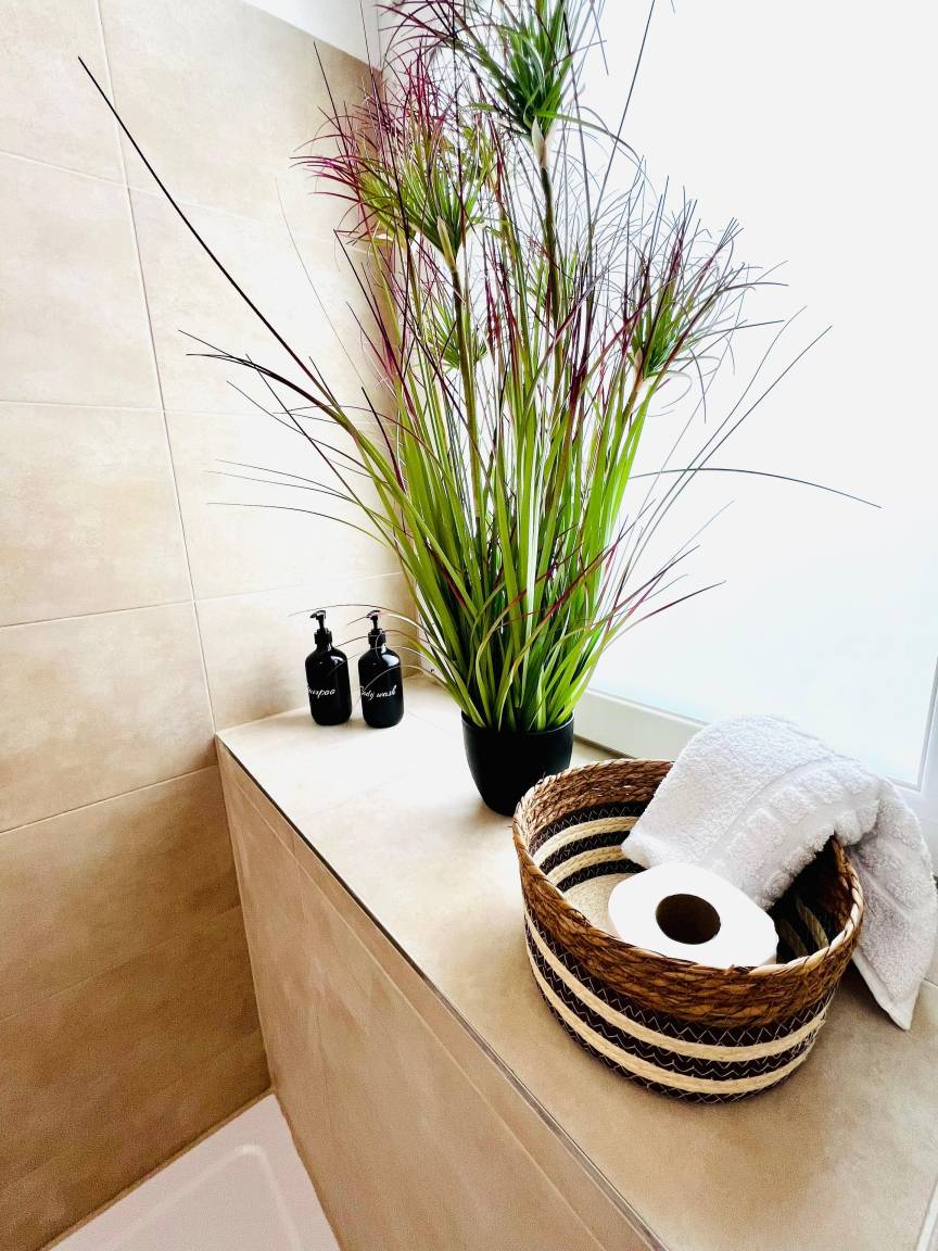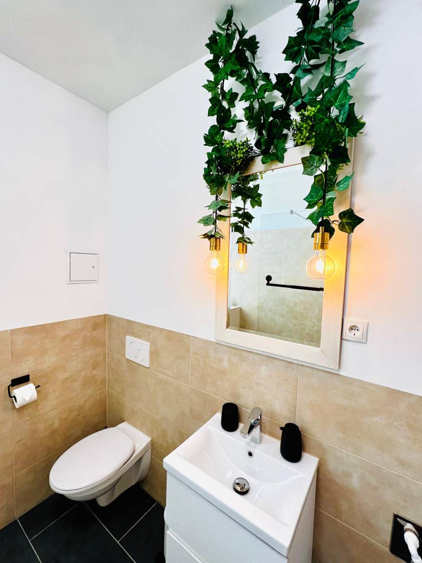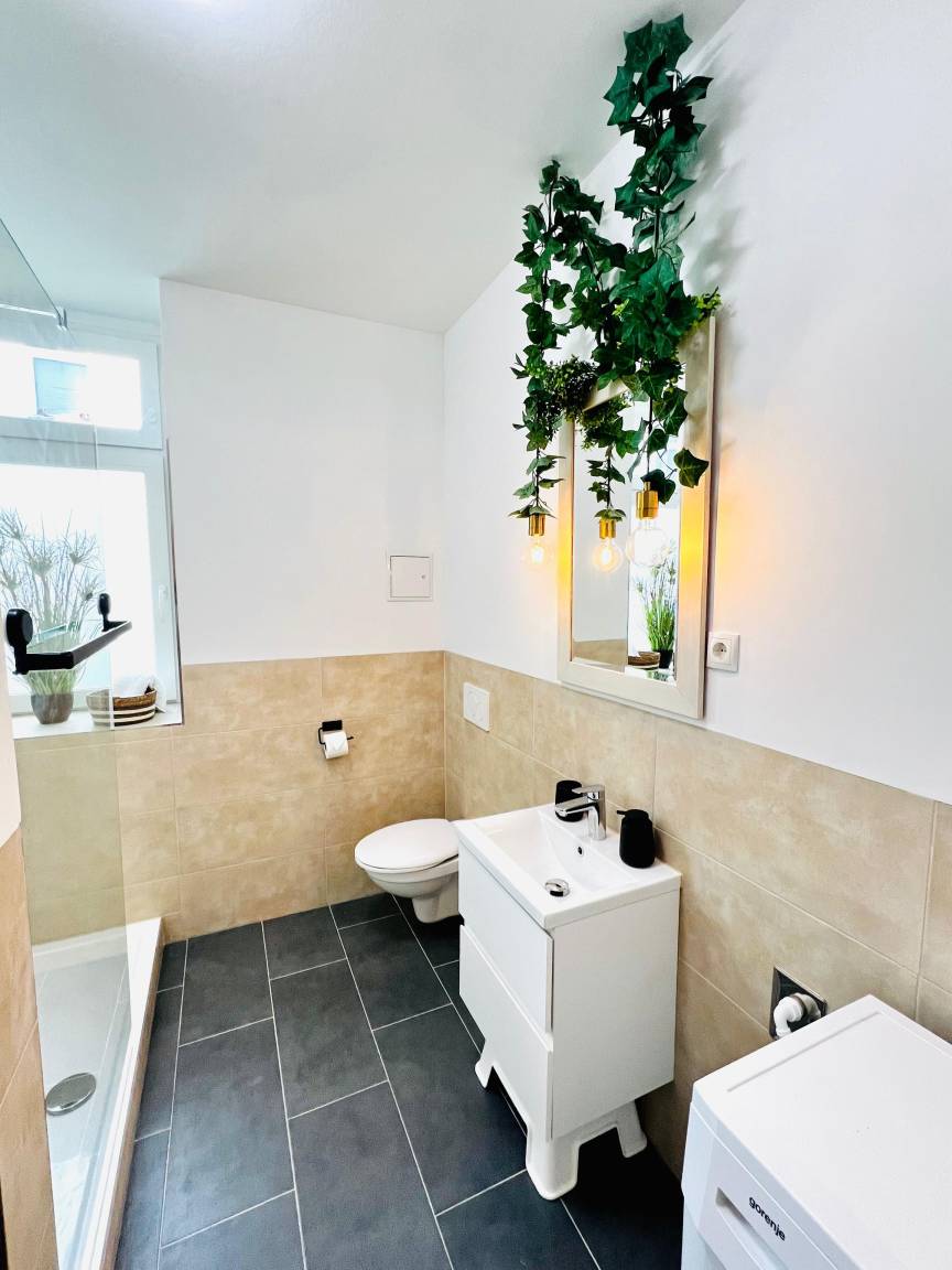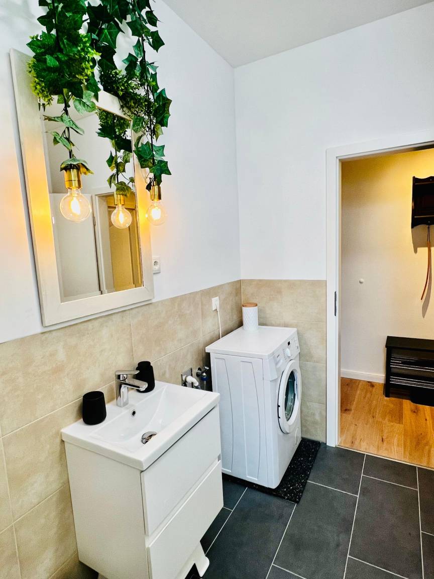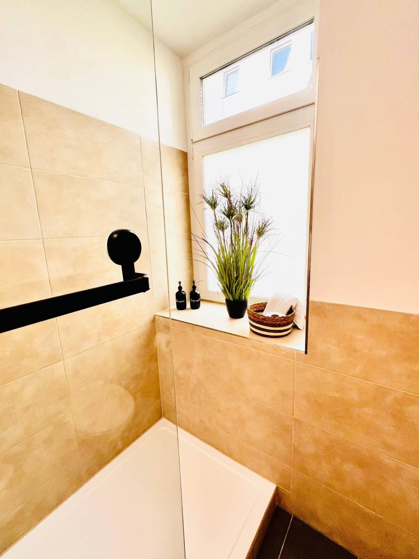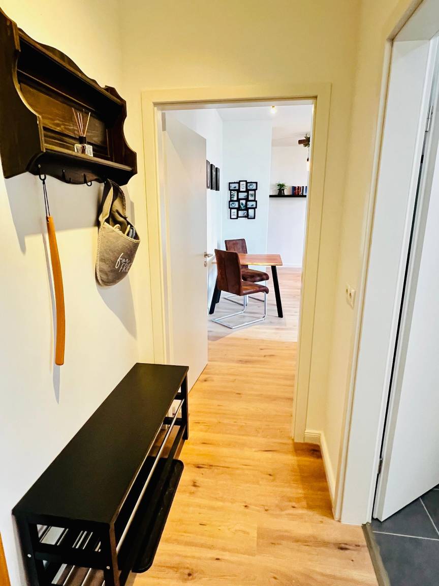 Die helle Diele heißt euch freundlich willkommen. Von hier aus gelangt ihr direkt in das moderne Badezimmer mit einer luxuriösen Walk-in-Dusche, hochwertiger Ausstattung und stimmungsvoller Beleuchtung.
