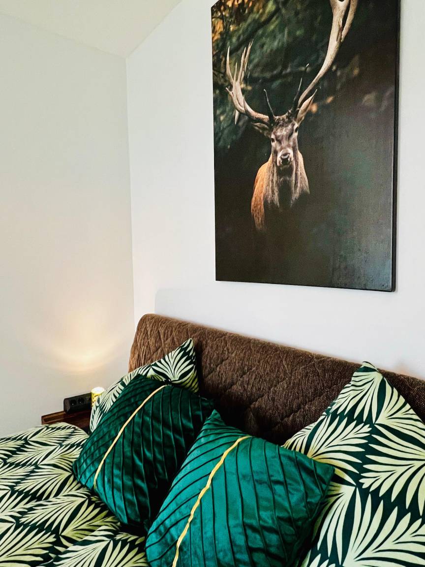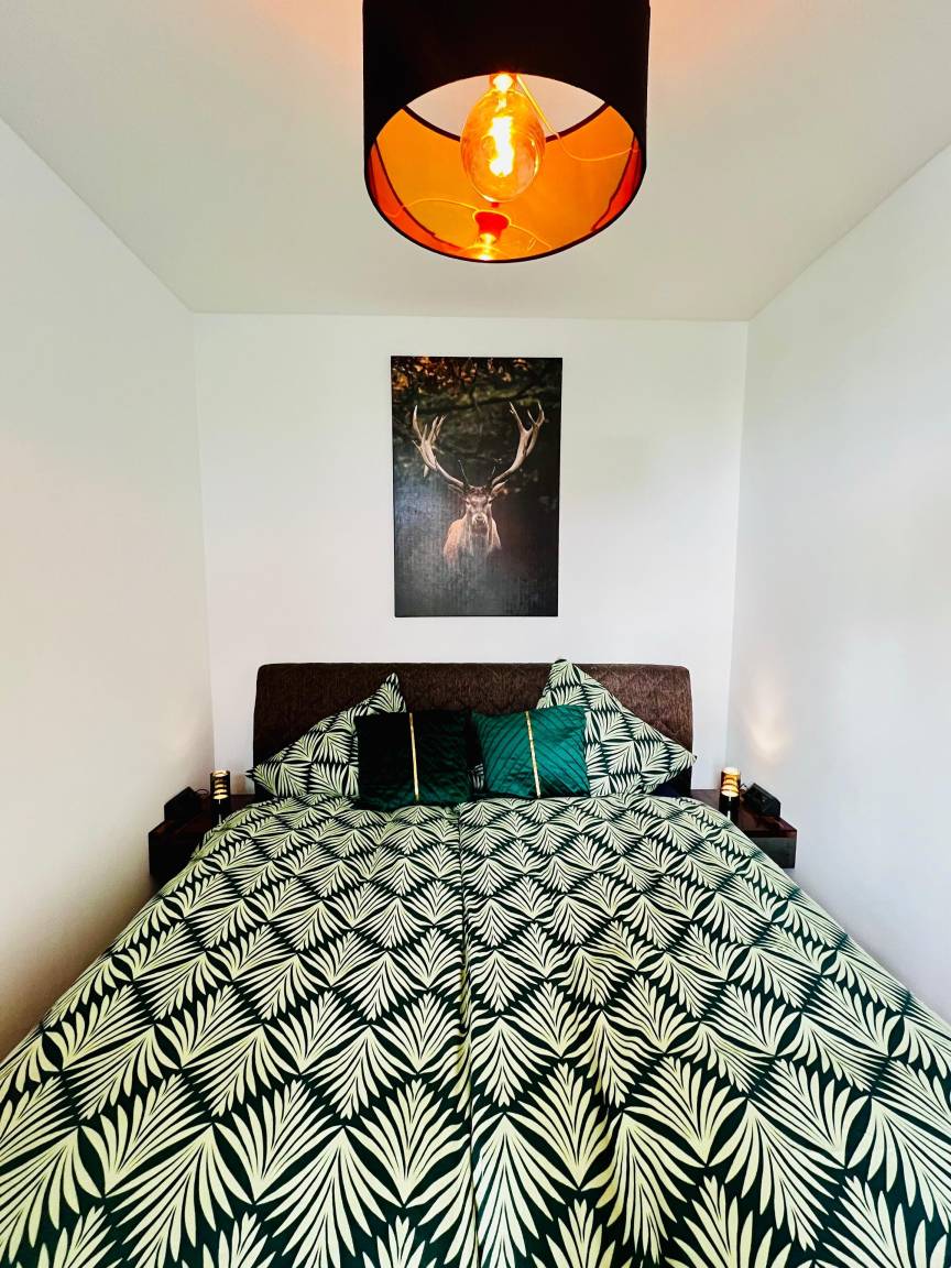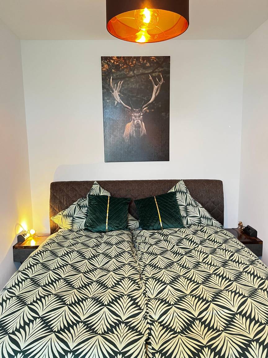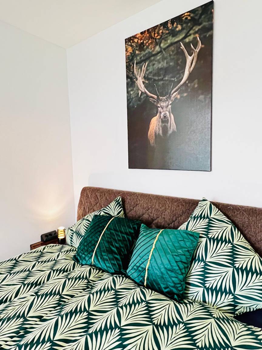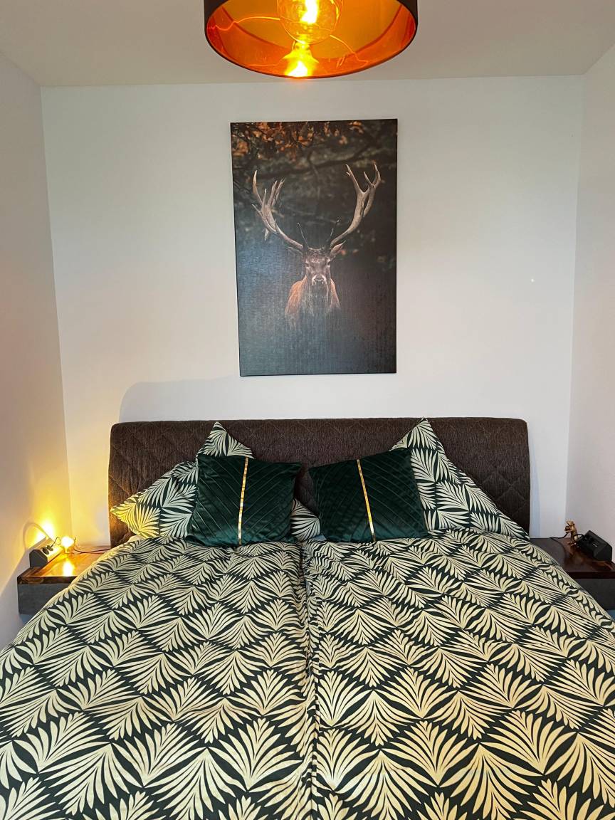 Durch das Wohnzimmer gelangt ihr in das ruhige Schlafzimmer mit einem komfortablen Boxspringbett – perfekt für erholsamen Schlaf.