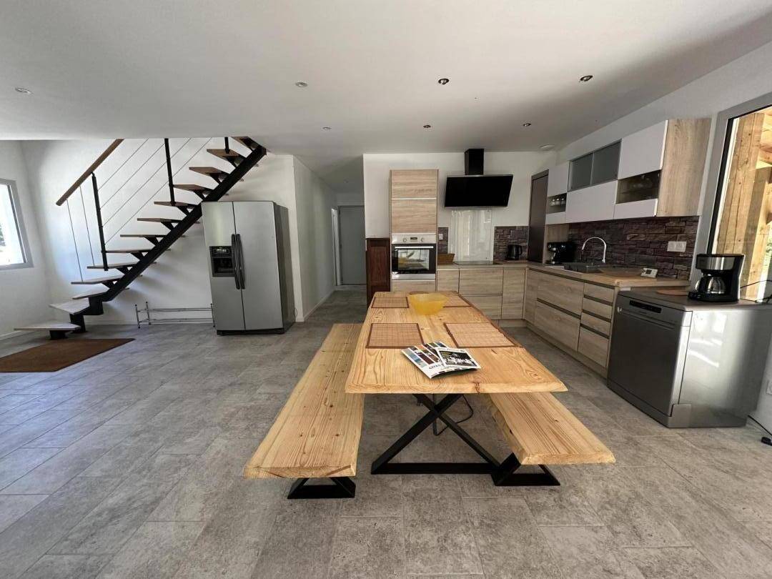 - Ein Wohnzimmer mit Einbauküche, Geschirrspüler, amerikanischem Kühlschrank, 4-Flammen-Induktionsherd, Elektrobackofen, Mikrowelle und ein Wohnzimmer mit Tischen.
