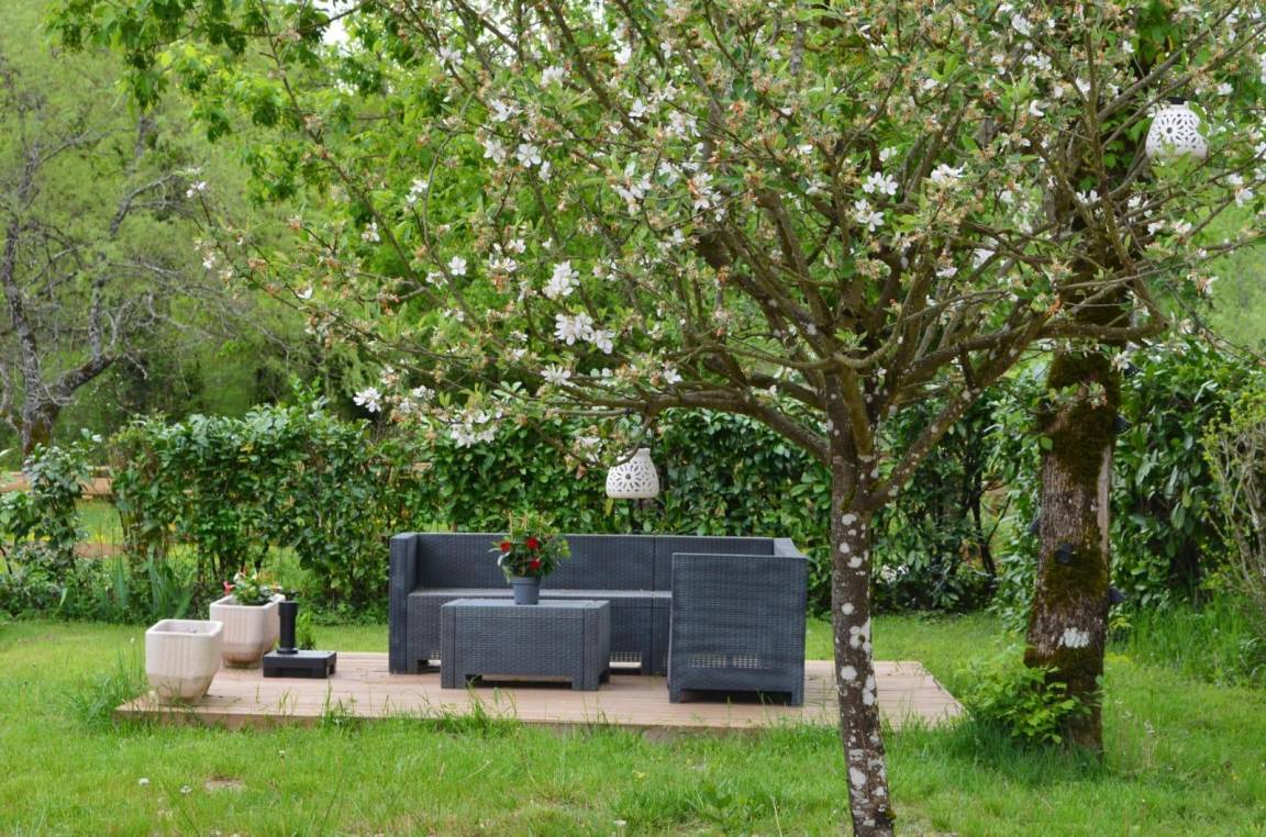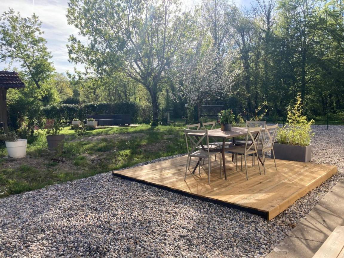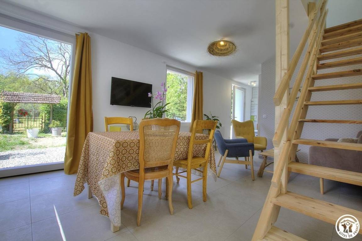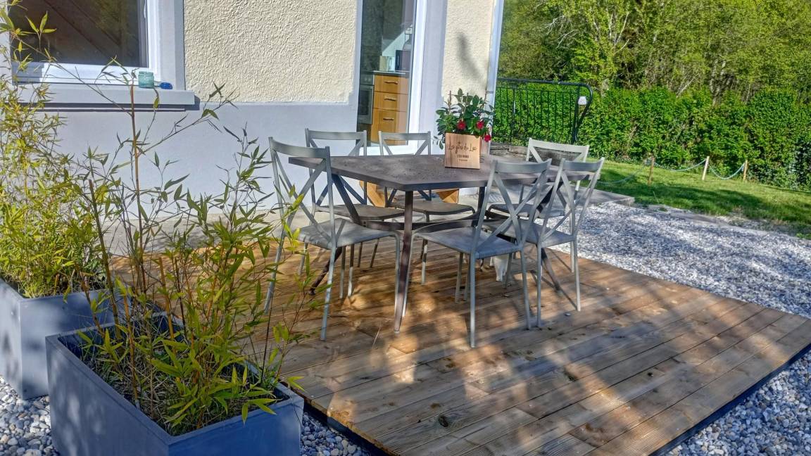 Das Gite du Lac – la charmette mit einer Kapazität von 6 Personen öffnet sich zu seinem Außenbereich in der Natur, auf der Ostseite bieten sich die Gartenmöbel als isolierte Pause an, auf der Südseite profitiert der Essbereich von seiner freien Aussicht des Fahrerlagers