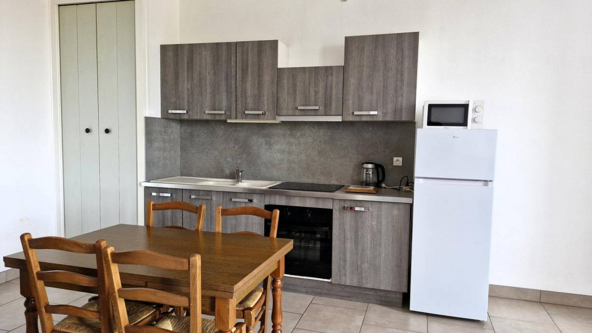 Wohnzimmer/Aufenthaltsraum mit Kochnische und Schlafsofa für 2 Personen, ein Schlafzimmer mit Doppelbett (140 x 190), Duschbad und WC.