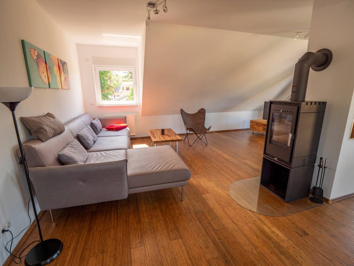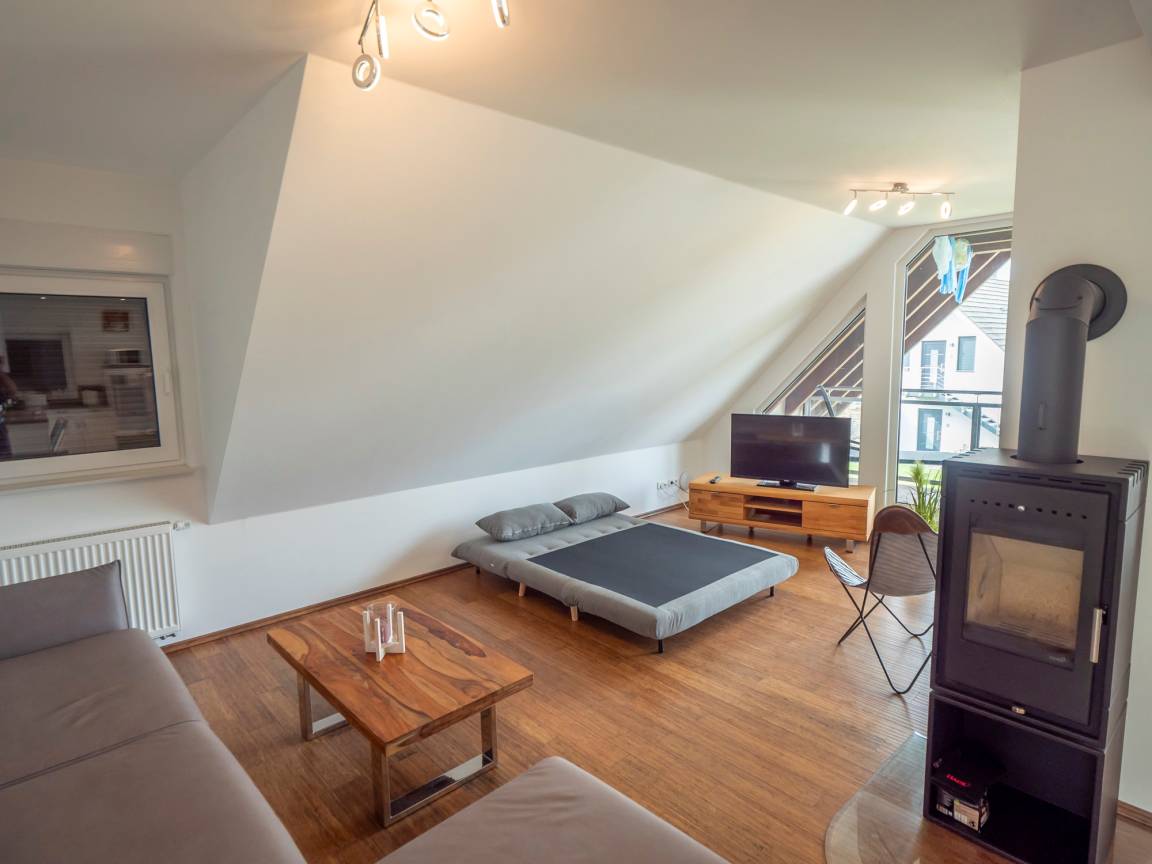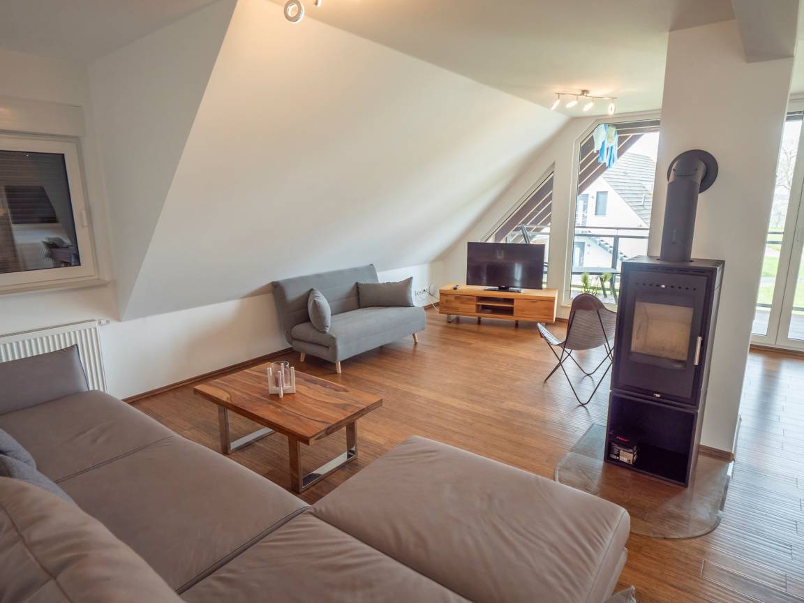 Der große hohe Wohnraum mit seiner verglasten Giebelwand und Ausgang zur ca. 20m² großen Loggia, wirkt hell und freundlich. Der Wohnraum mit Kamin bietet unseren Gästen auch bei nicht so schönem Wetter den ersehnten Urlaub. Sie können hierfür bei uns Feuerholz kaufen und müssen es nicht mitbringen.