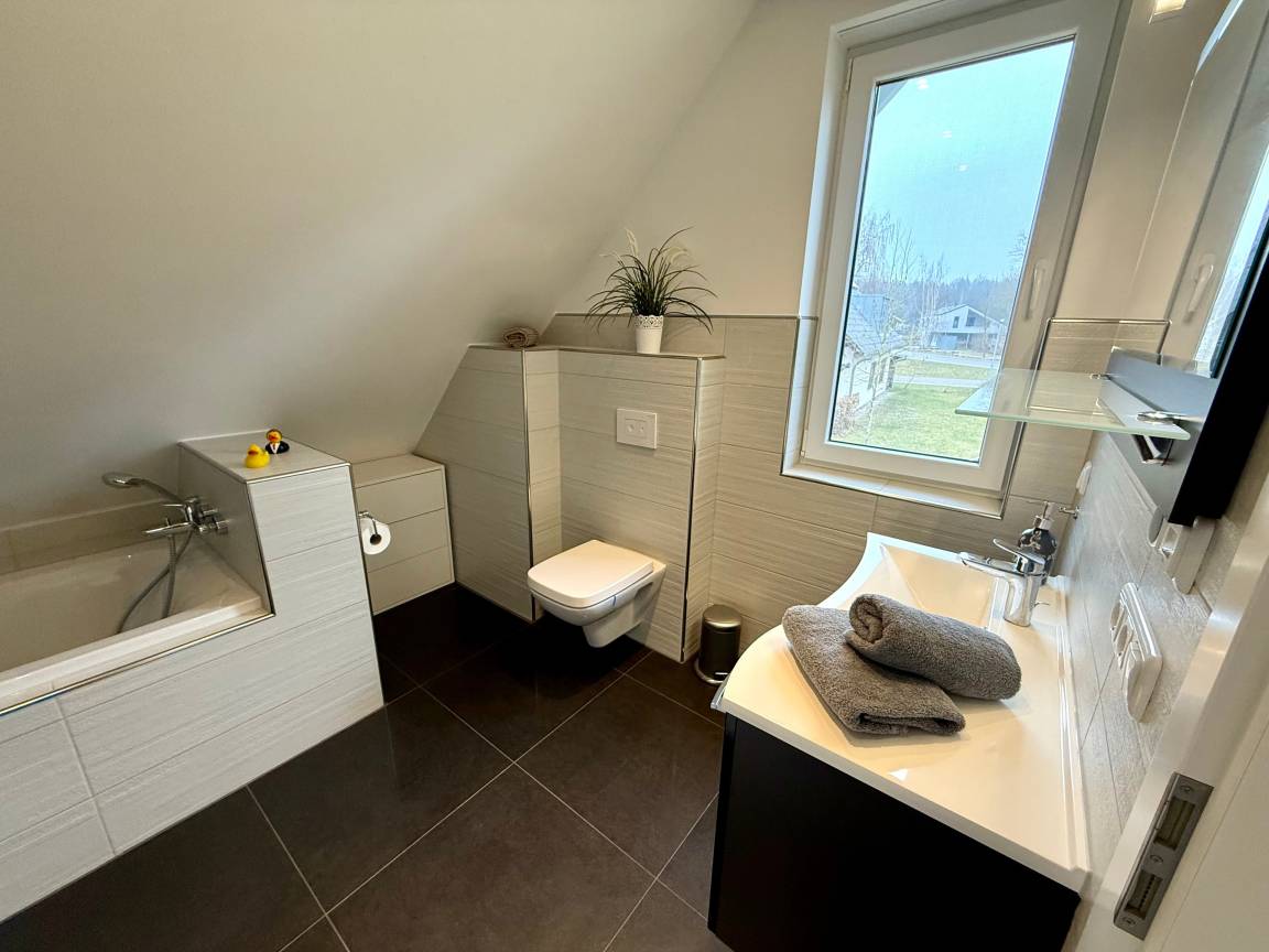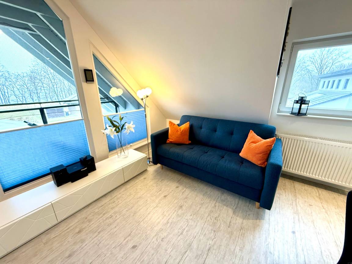 Das Herzstück der Wohnung ist das geräumige, lichtdurchflutete Wohnzimmer mit gemütlichem Kamin – perfekt für entspannte Abende. Die offene, modern ausgestattete Küche lädt zum gemeinsamen Kochen ein. Das Schlafzimmer mit hochwertigem Boxspringbett bietet Platz für 2 Personen und verspricht erholsamen Schlaf. Im Wohnzimmer steht eine komfortable Schlafcouch bereit, auf der 2 weitere Personen bequem übernachten können. Das stilvolle Badezimmer verfügt über eine Dusche und eine Badewanne für entspannende Momente.