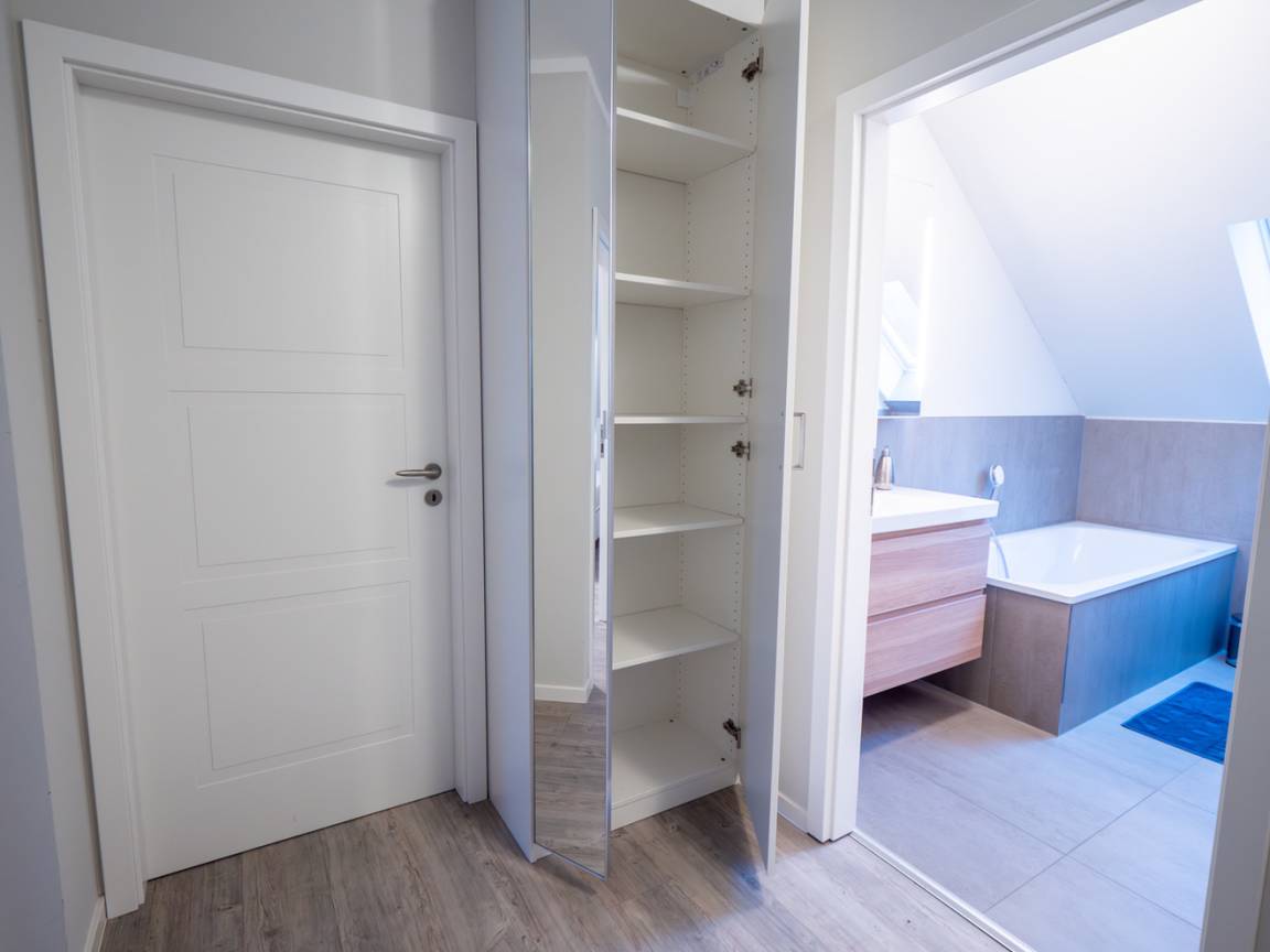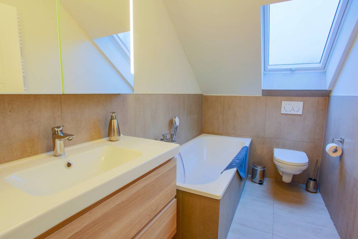 Ihnen stehen insgesamt 2 Badezimmer zur Verfügung. Das hochwertig ausgestattete Badezimmer im Erdgeschoss bietet Ihnen eine bodengleiche bequeme Dusche, Waschtisch, Handtuchwärmer & WC. Nebenan finden Sie eine Infrarot Sauna, die gerade in der kühlen Jahreszeit für entspannte Momente sorgt. Das Badezimmer Nr. 2 befindet sich im Dachgeschoß und verfügt über eine Badewanne mit Dusche, ein Waschbecken und WC.