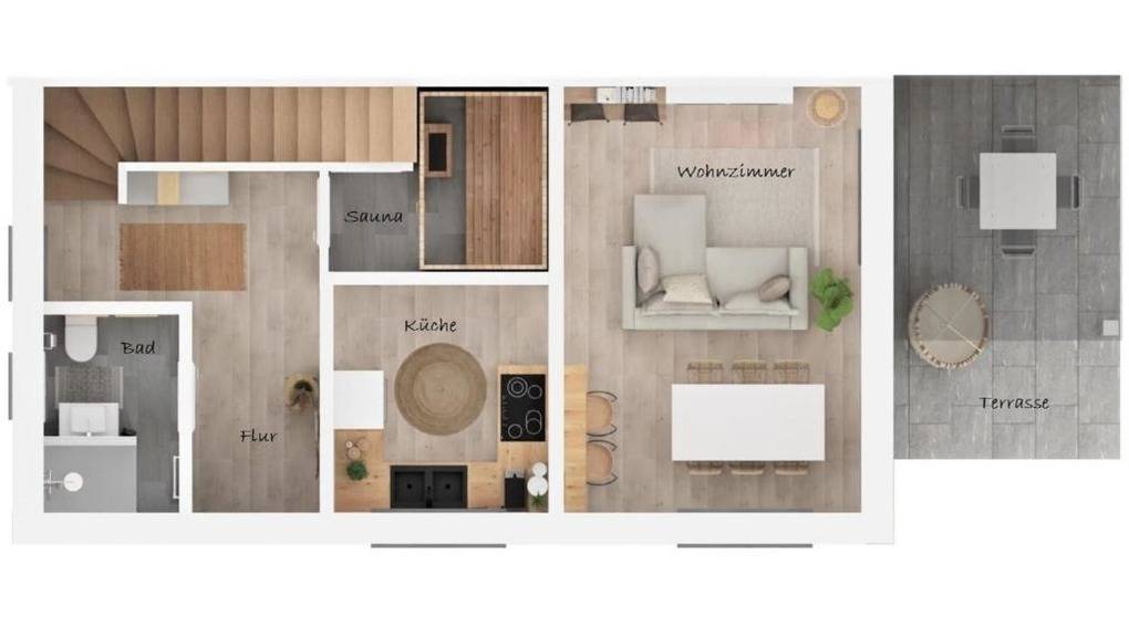 Der exklusiv eingerichtete Wohnbereich mit Zugang zur Terrasse vermittelt eine tolle Wohlfühl-Atmosphäre, welche durch den hochwertigen Elektro-Wärme-Kamin noch verstärkt wird.