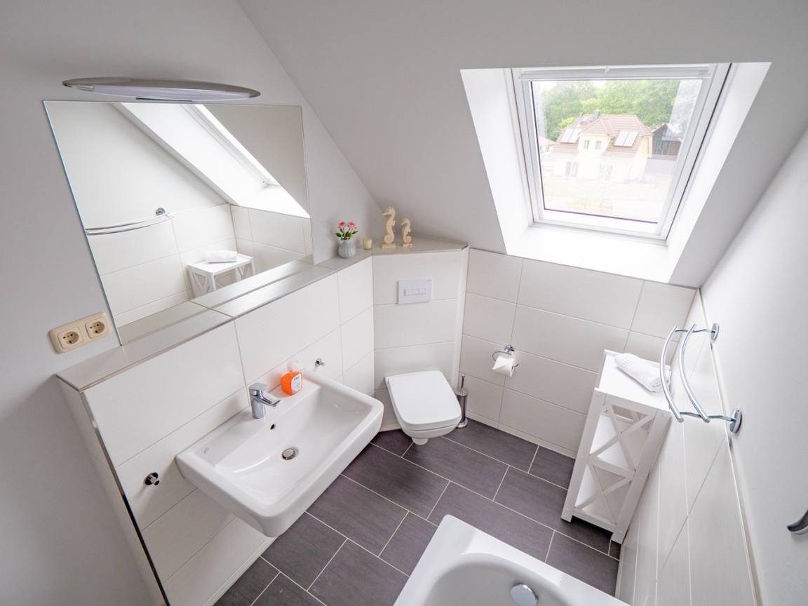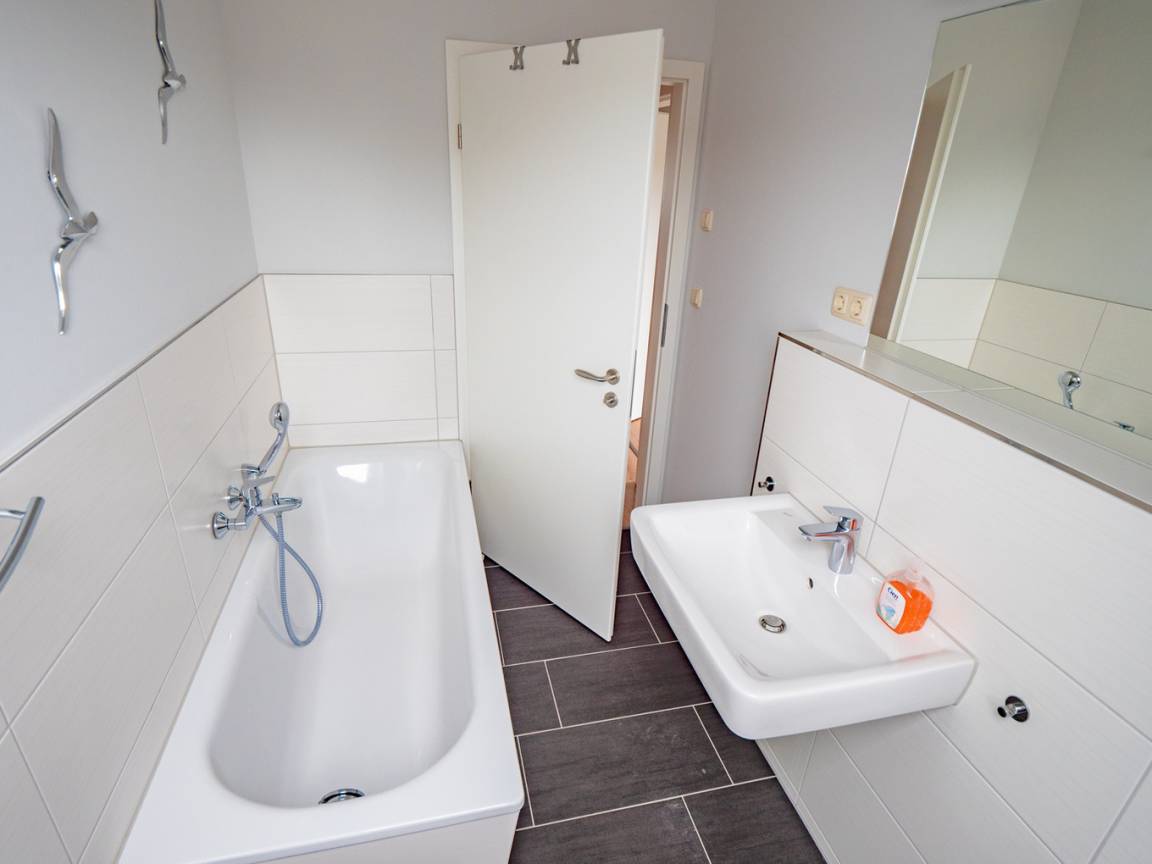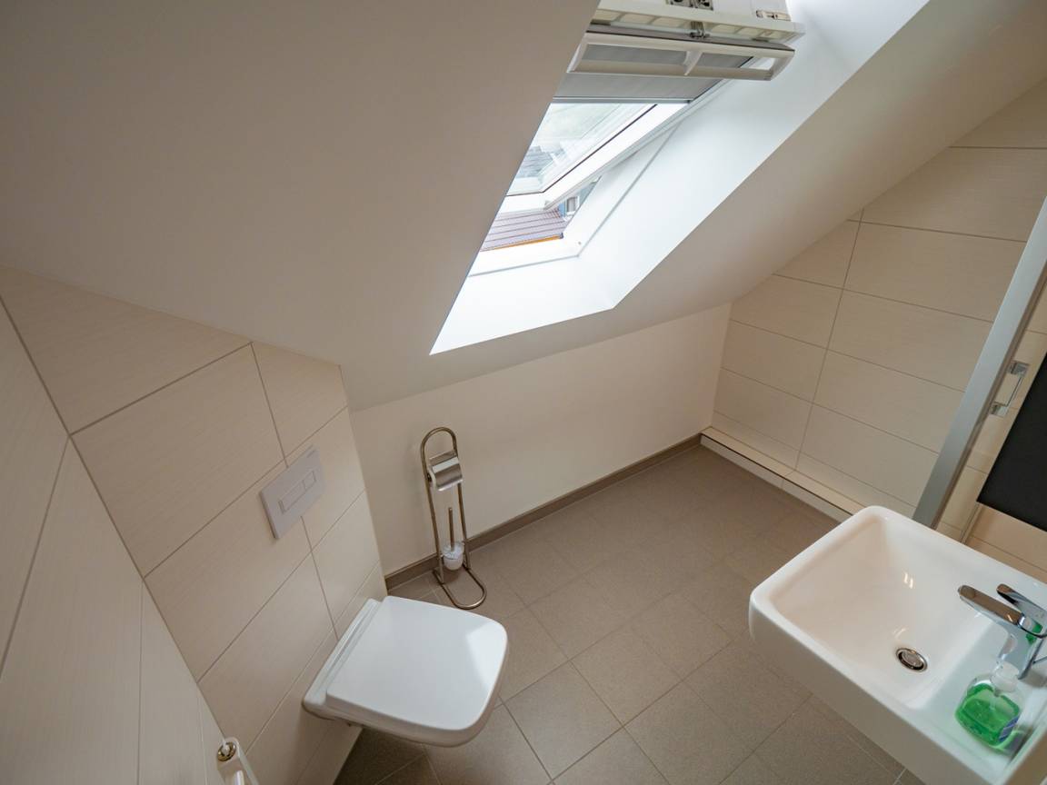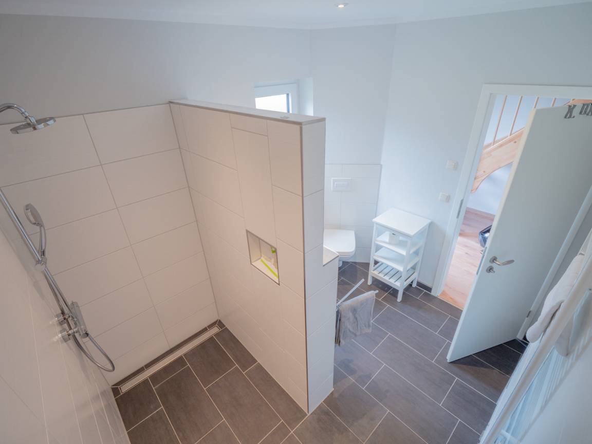 Ihnen stehen insgesamt 3 Badezimmer zur Verfügung. Das hochwertig ausgestattete Badezimmer im Erdgeschoss bietet Ihnen eine bodengleiche bequeme Dusche, Waschtisch und WC.