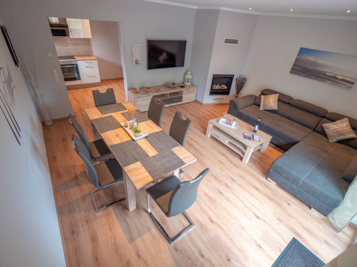 Der exklusiv eingerichtete Wohnbereich mit Zugang zur Terrasse vermittelt eine tolle Wohlfühl-Atmosphäre, welche durch den hochwertigen Elektro-Wärme-Kamin noch verstärkt wird.