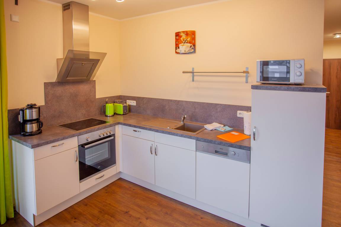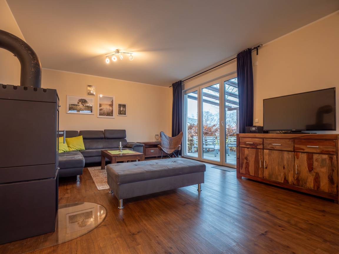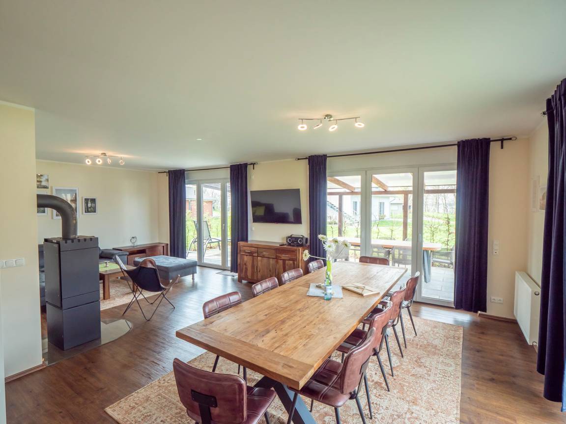 Die offene Küche ist vollständig ausgestattet und hat viel Platz für einen großen Esstisch, an dem bis zu zehn Personen Platz haben. Von dort aus ist es ein fließender Übergang zum Wohnzimmer mit der großen, gemütlichen Couch. An kühlen Abenden können Sie den Ofen im Wohnraum anzünden, der zusätzlich zur Zentralheizung für wohlige Wärme sorgt. Kaminholz stellen wir gegen Aufpreis zur Verfügung. Sie brauchen dies nicht mitzubringen.